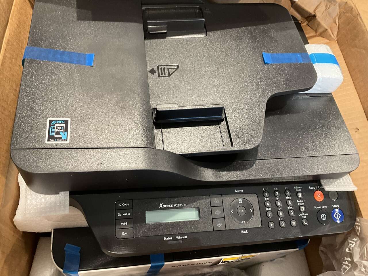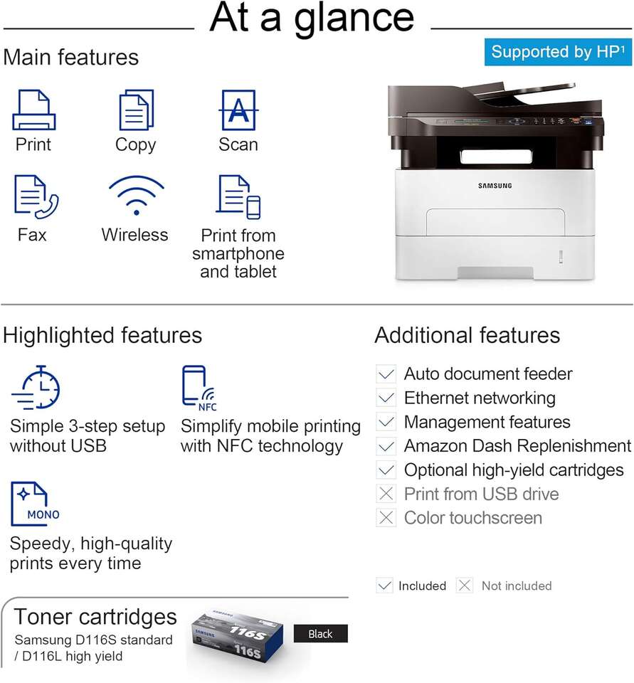 High-end laser printer with duplexing, wifi and NFC printing and built-in ethernet. Has automatic document feeder for copying/scanning. Get Print on tap - NFC enables your mobile device to connect and communicate with your printer. Simply tap your NFC-enabled Phone or tablet to this monochrome laser printer and start the Print, scan, copy or fax jobs (Android device only). Easy mobile printing - download the free Samsung mobile print app, Use Air Print or Google cloud Print and Print directly with your mobile device from this wireless laser printer. Fast speed printing - Print up to 29 pages per minute. Recommended monthly volume of 250-2, 000 pages. Professional image quality – get sharp, crisp images and text produced by Samsung's innovative imaging technology. Wide range of paper size SUPPORT – from 3" X 6" – 8. 5" X 14" Plain paper, Recycled paper, label, cardstock, colored, glossy paper and others.