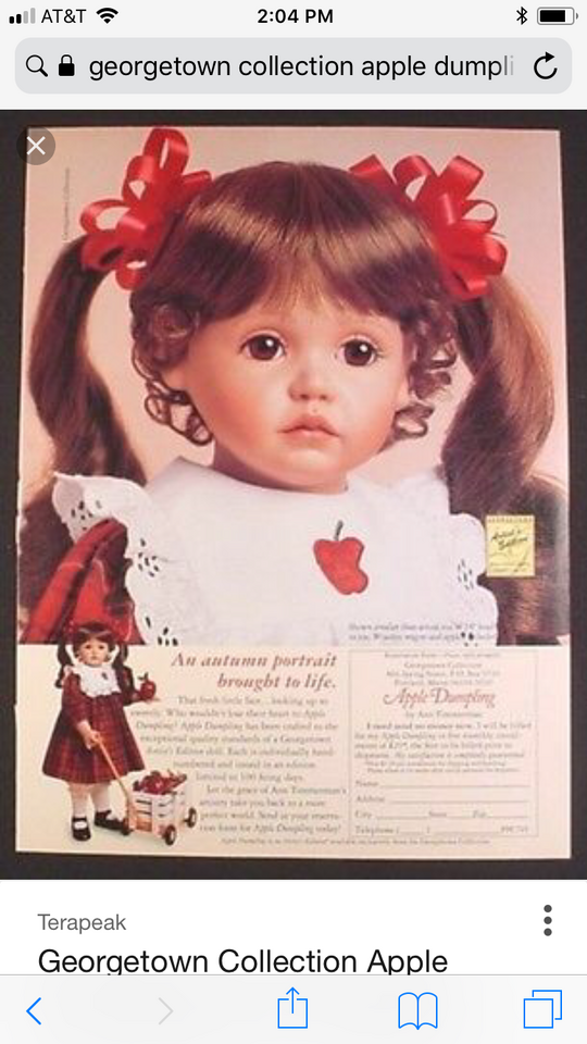 This vintage doll is by Ann Timmerman. She is a part of the Artist's Ed exclusively G-town collection and stands 18 Inches tall. Comes with stand, apples & wagon.