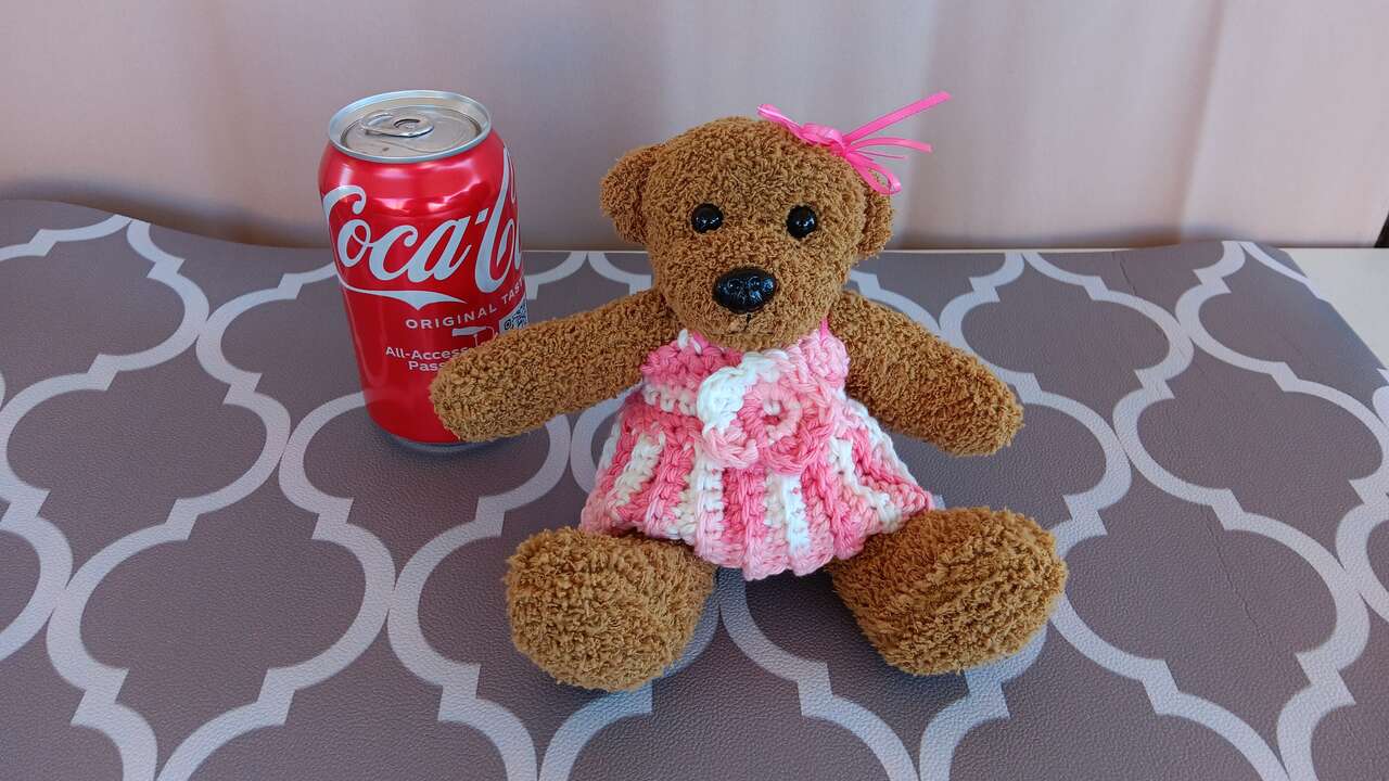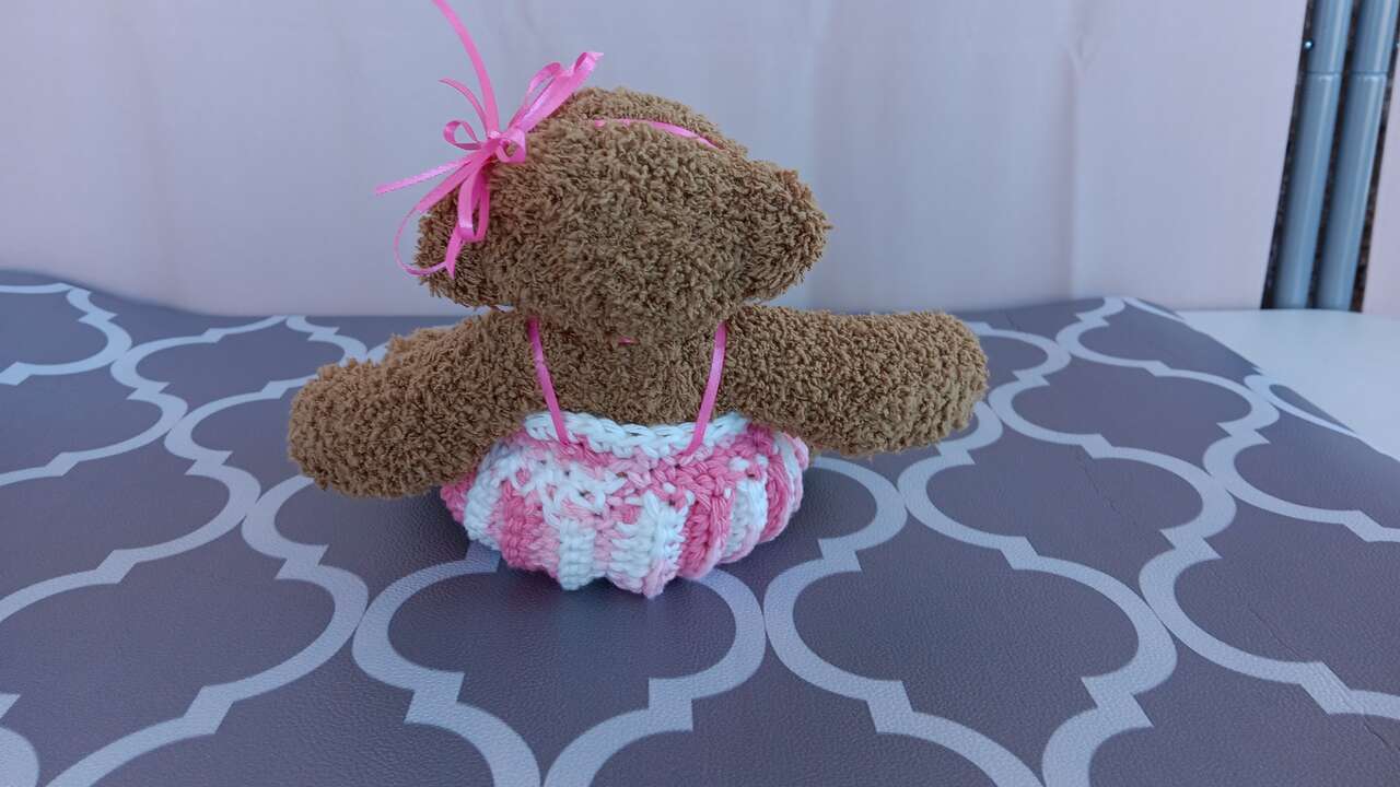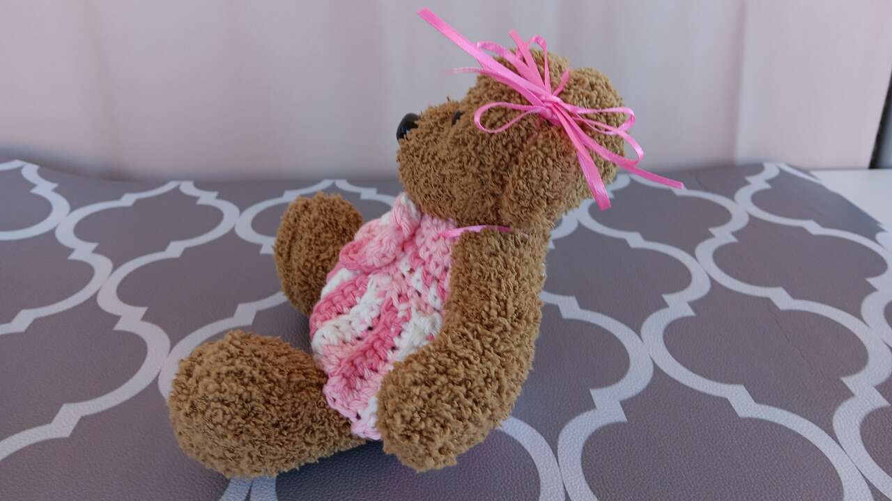 “Rosa”- Pretty in pink, six inch sitting bear beautifully dressed in a handmade outfit. Each bear has its own unique outfit (no patterns used). All new materials. Made for decorative purposes (some pieces may pose choking hazard to children). Please mention “Rosa” when contacting for purchase, as we have other bears for sale.