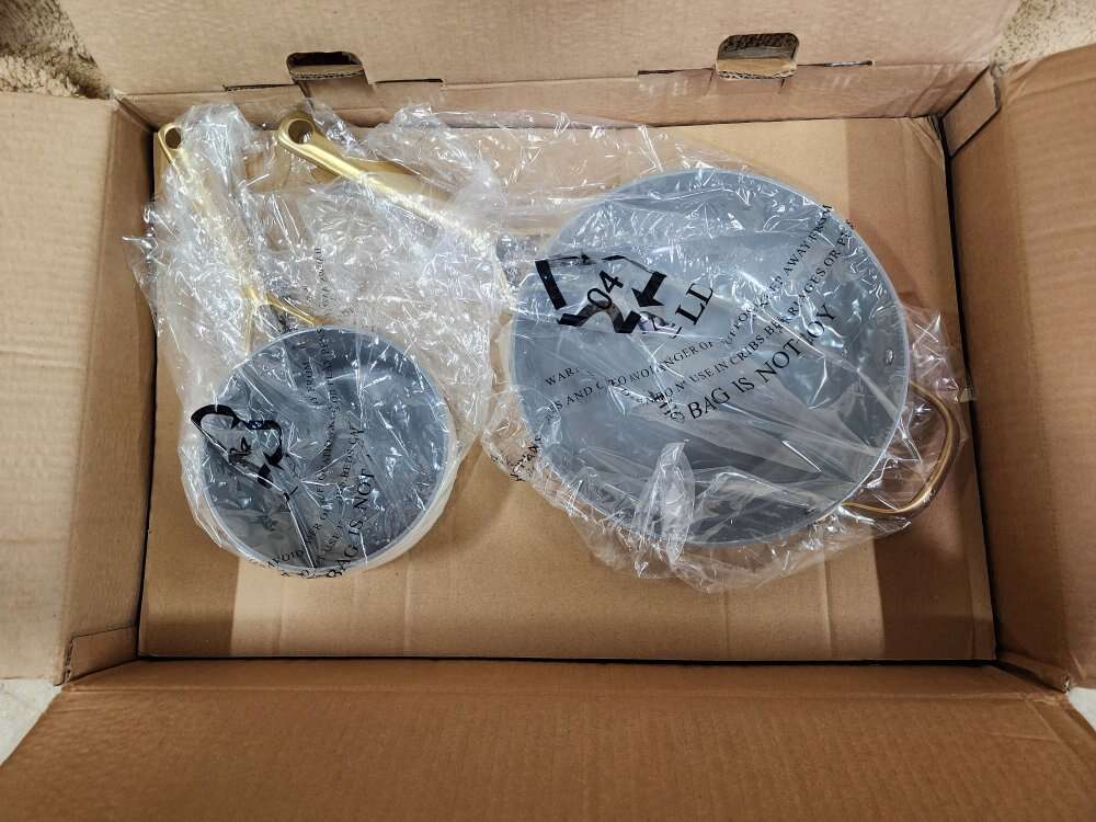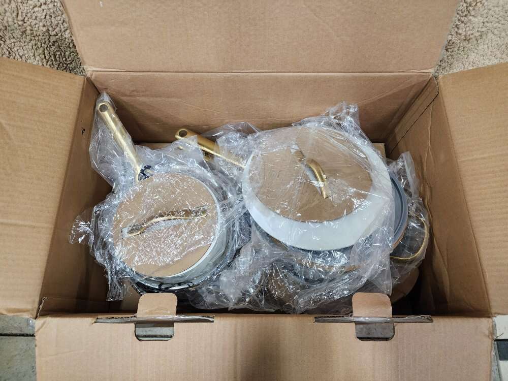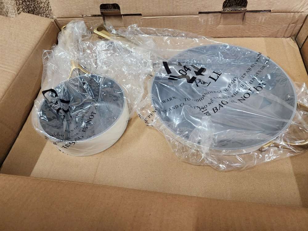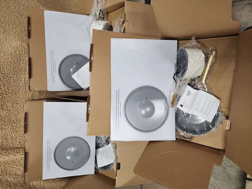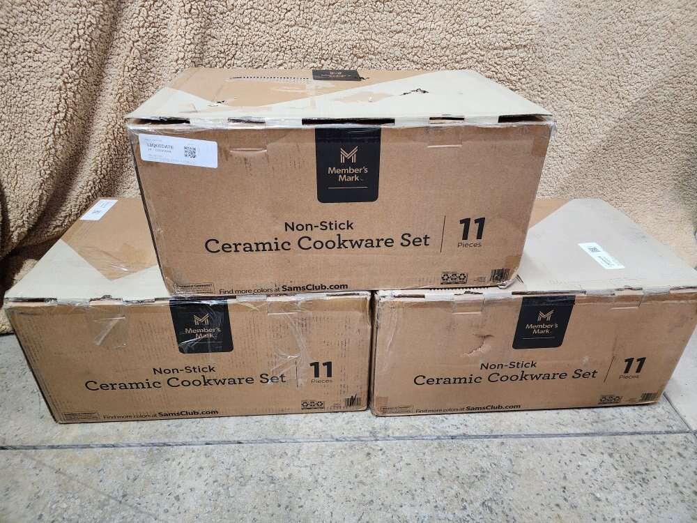 VenmoThis is a new 11-piece ceramic cookware set in cream and gold. This is a beautiful pot and pan set. I have 3 of these new cream sets available. We will take cash or Venmo. Our Member's Mark™ 11-Piece Modern Ceramic Cookware is a stylish addition to the kitchen that makes healthier cooking easy. Enjoy perfectly cooked steaks, stews, scrambled eggs and sauteed veggies with this versatile set of pots and pans, including two Dutch ovens. Featuring nonstick interiors and durable heavy-gauge aluminum construction, this long-lasting set of cookware makes it so you can cook with less oil and fast cleanup. This complete 11-Piece Modern Cookware Set includes: 9.5 fry pan 11 fry pan, 2-quart covered saucepan with lid, 3-quart Dutch oven with lid, 6-quart Dutch oven with lid, 4-quart deep sauté pan with lid, Multi-function stainless-steel basket. Add to your collection with the Member's Mark 3-Piece Modern Ceramic Fry Pan Set and the Member's Mark 5.5-Quart Ceramic Jumbo Cooker. Superior Nonstick Cookware Unlike traditional nonstick cookware, this set of pots and pans features ceramic nonstick interior. Now you can enjoy superior nonstick performance with high release and easy cleaning after every meal. The impact-bonded honeycomb base makes this set safe for all stovetops, including induction. Plus, these pans are oven safe up to 450°F—talk about versatile! Nonstick Cooking with Less Oil and Butter The nonstick interiors of this cookware require less oil or butter while you're cooking for healthier meals that don't stick to the pans. The heavy-gauge aluminum construction delivers even heat distribution and long-lasting durability for years of cooking. Even Heating and Enhanced Flavor The specially designed cast aluminum lids have a curved shape for self-moistening circulation during cooking that protects food from drying out. The unique design gently cooks your dishes and enhances the flavors of the food during cooking. Care and Storage This set is dishwasher safe. Hand washing is recommended to extend the life of your cookware. It's oven-safe to 450°F (232°C) and suitable for use on all cooktops, including induction. To extend the life of your cookware, cook only on low to medium heat; never on extremely high heat as it can ruin the nonstick interior. Clean the cookware before the first use. Handwash your pans in warm, soapy water. After cooking: Allow your cookware to cool down completely before running cold water (to avoid warping your pans). Once the pans are cool, clean the interior of the pans with warm, soapy water and a non-abrasive dishcloth or sponge. Dry with a soft towel. Stubborn food can be removed with a sponge or non-abrasive scrubber and a little powder cleanser (like Bar Keeper’s Friend). Handwash Recommended This cookware is dishwasher safe. Hand washing and drying is always recommended to maintain the original look and performance of the interior and exterior finishes. If hand washing, use liquid dishwashing detergent with a sponge, nylon pad or dish cloth when cleaning cookware. A non-abrasive polishing cleanser may also be used for stains. Do not use oven cleaner, harsh detergents, chlorine bleach, steel wool or other abrasive cleaning pads. How to Clean Difficult Stains Food will be carbonized on the cooking surface at high temperatures, forming tiny black dirt marks. You can easily remove it from your ceramic cooking surface. 1. Pour vinegar onto a scrubbing pad and scrub the stain. Vinegar is effective in removing most stains. 2. Make a paste of 1 tablespoon baking soda and 2 tablespoons vinegar in a pan and fill warm water. Let the pan sit for a few hours then scrub the stains. Is this set of cookware compatible with all cooktops? Yes, the Member's Mark 11-Piece Modern Ceramic Cookware Set features a stainless steel stay-flat honeycomb base designed for use with induction cooking. The diameter of the pan’s induction base should be