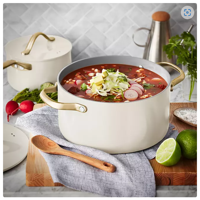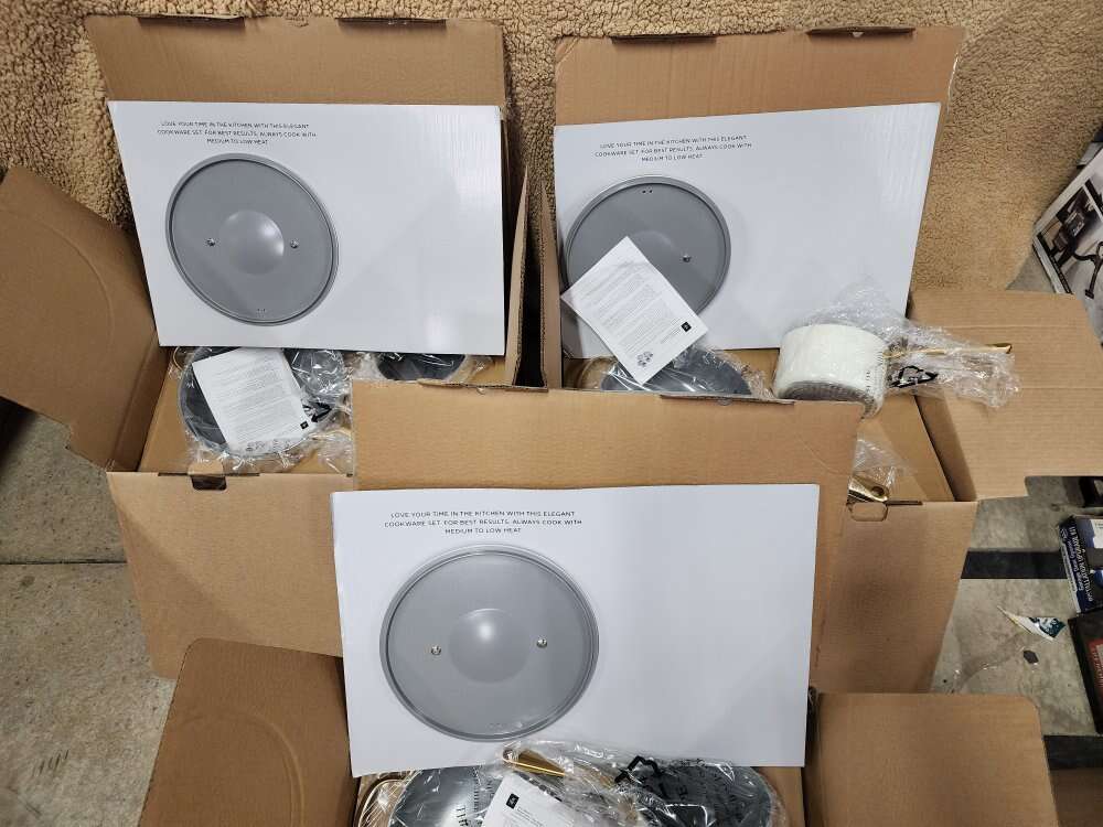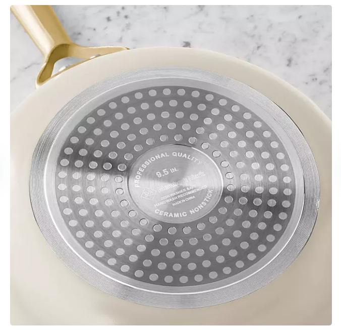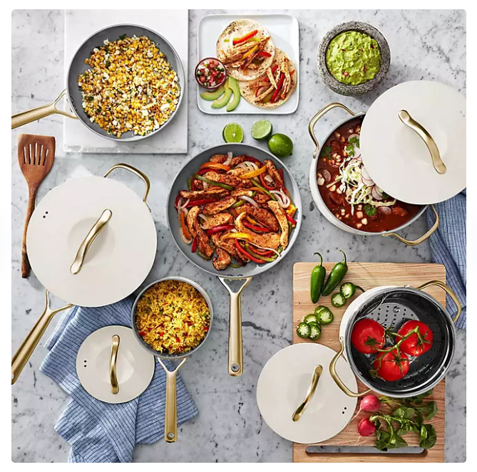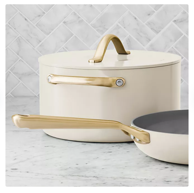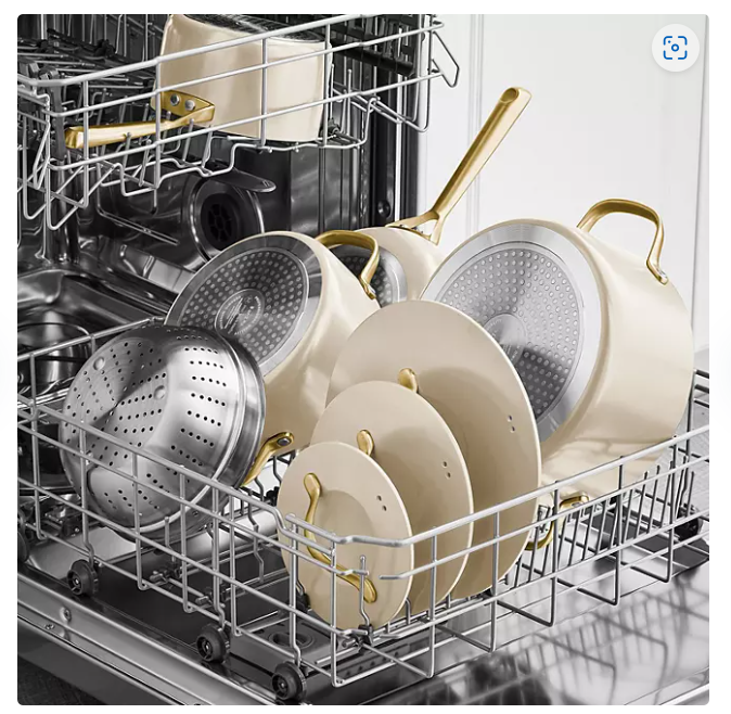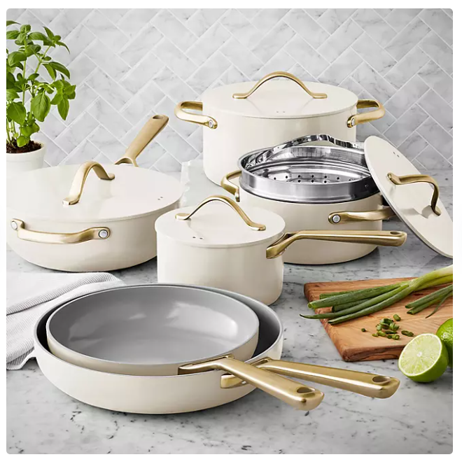 VenmoThis is a new 11-piece ceramic cookware set in cream and gold. This is a beautiful pot and pan set. I have 3 of these new cream sets available. We will take cash or Venmo. Our Member's Mark™ 11-Piece Modern Ceramic Cookware is a stylish addition to the kitchen that makes healthier cooking easy. Enjoy perfectly cooked steaks, stews, scrambled eggs and sauteed veggies with this versatile set of pots and pans, including two Dutch ovens. Featuring nonstick interiors and durable heavy-gauge aluminum construction, this long-lasting set of cookware makes it so you can cook with less oil and fast cleanup. This complete 11-Piece Modern Cookware Set includes: 9.5 fry pan 11 fry pan, 2-quart covered saucepan with lid, 3-quart Dutch oven with lid, 6-quart Dutch oven with lid, 4-quart deep sauté pan with lid, Multi-function stainless-steel basket. Add to your collection with the Member's Mark 3-Piece Modern Ceramic Fry Pan Set and the Member's Mark 5.5-Quart Ceramic Jumbo Cooker. Superior Nonstick Cookware Unlike traditional nonstick cookware, this set of pots and pans features ceramic nonstick interior. Now you can enjoy superior nonstick performance with high release and easy cleaning after every meal. The impact-bonded honeycomb base makes this set safe for all stovetops, including induction. Plus, these pans are oven safe up to 450°F—talk about versatile! Nonstick Cooking with Less Oil and Butter The nonstick interiors of this cookware require less oil or butter while you're cooking for healthier meals that don't stick to the pans. The heavy-gauge aluminum construction delivers even heat distribution and long-lasting durability for years of cooking. Even Heating and Enhanced Flavor The specially designed cast aluminum lids have a curved shape for self-moistening circulation during cooking that protects food from drying out. The unique design gently cooks your dishes and enhances the flavors of the food during cooking. Care and Storage This set is dishwasher safe. Hand washing is recommended to extend the life of your cookware. It's oven-safe to 450°F (232°C) and suitable for use on all cooktops, including induction. To extend the life of your cookware, cook only on low to medium heat; never on extremely high heat as it can ruin the nonstick interior. Clean the cookware before the first use. Handwash your pans in warm, soapy water. After cooking: Allow your cookware to cool down completely before running cold water (to avoid warping your pans). Once the pans are cool, clean the interior of the pans with warm, soapy water and a non-abrasive dishcloth or sponge. Dry with a soft towel. Stubborn food can be removed with a sponge or non-abrasive scrubber and a little powder cleanser (like Bar Keeper’s Friend). Handwash Recommended This cookware is dishwasher safe. Hand washing and drying is always recommended to maintain the original look and performance of the interior and exterior finishes. If hand washing, use liquid dishwashing detergent with a sponge, nylon pad or dish cloth when cleaning cookware. A non-abrasive polishing cleanser may also be used for stains. Do not use oven cleaner, harsh detergents, chlorine bleach, steel wool or other abrasive cleaning pads. How to Clean Difficult Stains Food will be carbonized on the cooking surface at high temperatures, forming tiny black dirt marks. You can easily remove it from your ceramic cooking surface. 1. Pour vinegar onto a scrubbing pad and scrub the stain. Vinegar is effective in removing most stains. 2. Make a paste of 1 tablespoon baking soda and 2 tablespoons vinegar in a pan and fill warm water. Let the pan sit for a few hours then scrub the stains. Is this set of cookware compatible with all cooktops? Yes, the Member's Mark 11-Piece Modern Ceramic Cookware Set features a stainless steel stay-flat honeycomb base designed for use with induction cooking. The diameter of the pan’s induction base should be