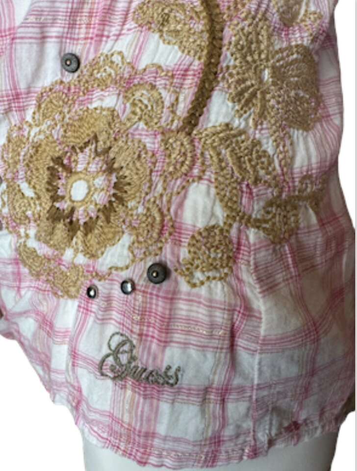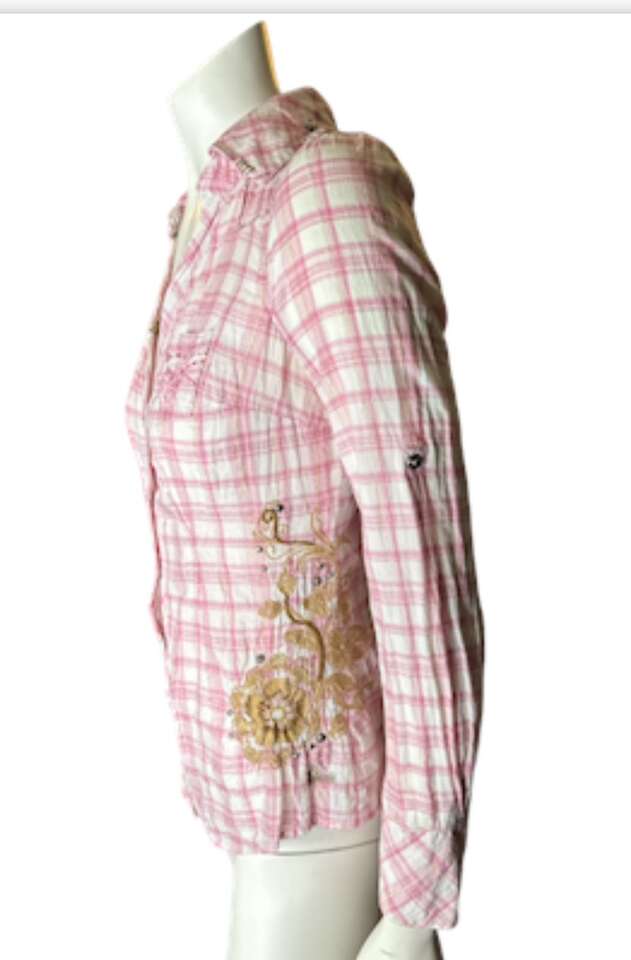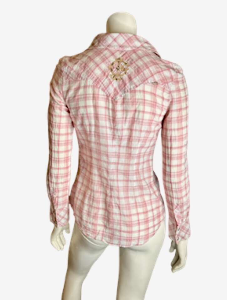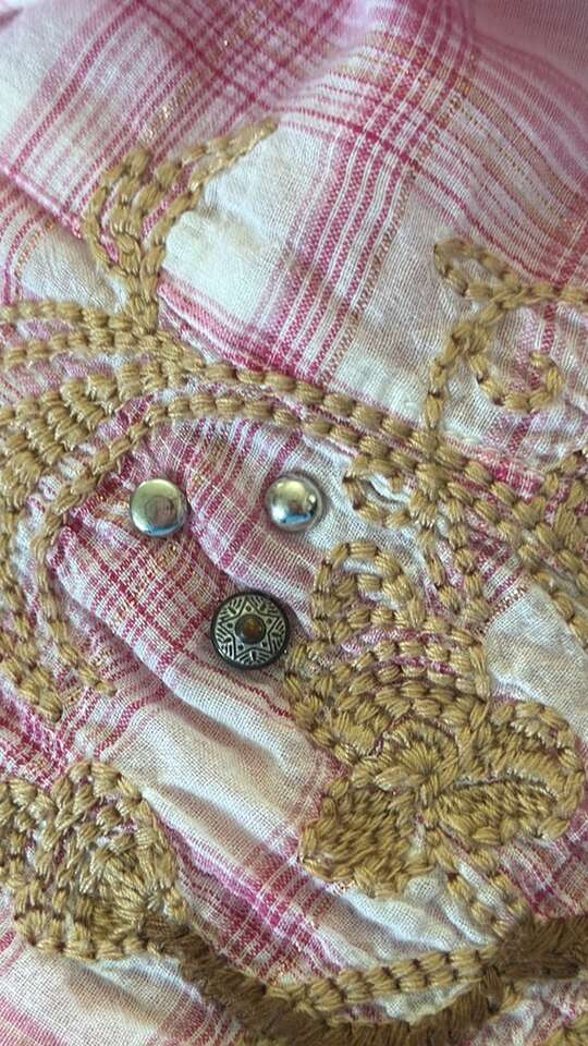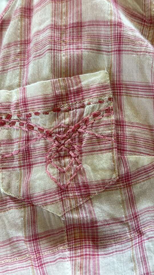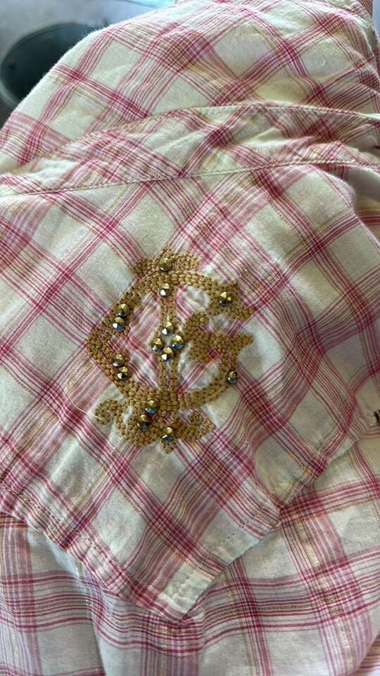 Pearl snaps roll up long sleeves.
