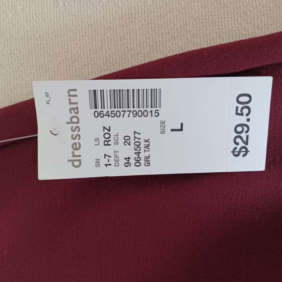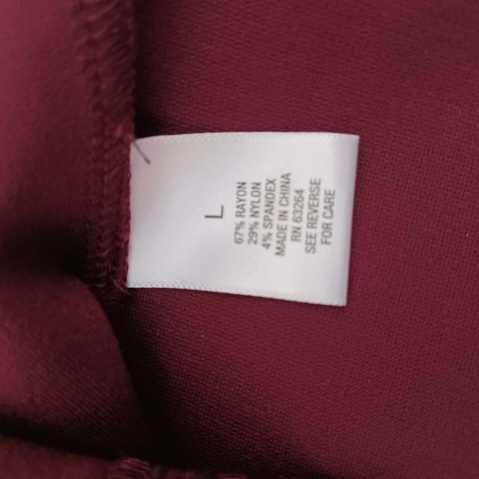 New with Tag Size L Reg. $29.50 Burgundy color 67% Rayon 29% Nylon 4% Spandex Nothing wrong with it. Just doesn't fit, Sat in closer too long to return. From a smoke and pet free home.
