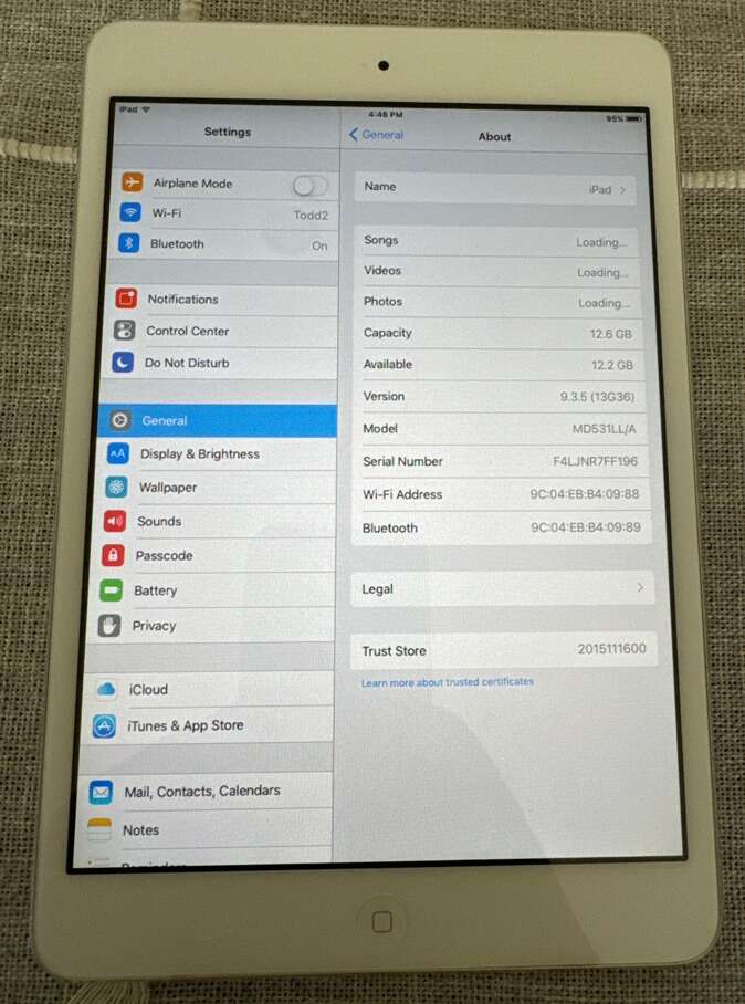 12.6 GB, everything works fine, holds charge well. Unfortunately we don’t have the charging cord.