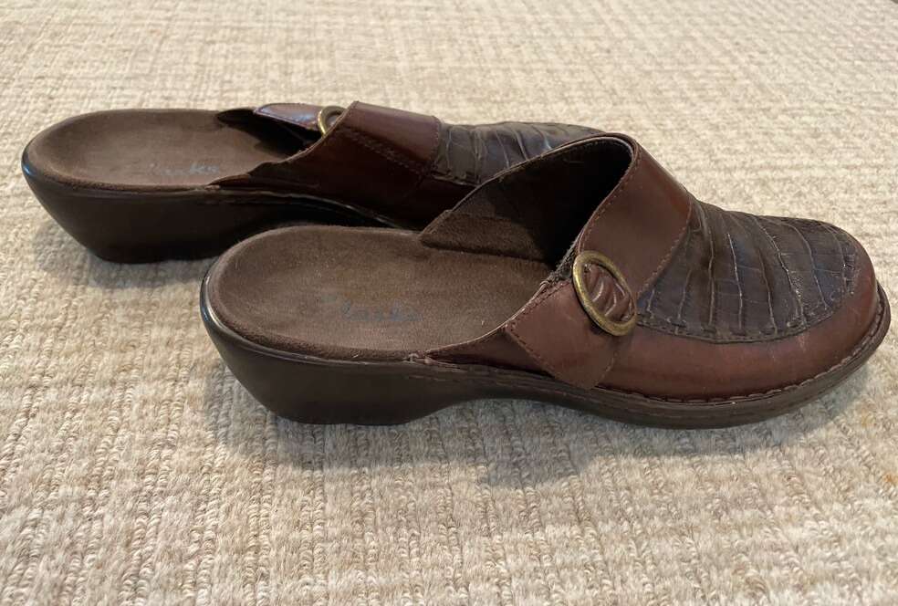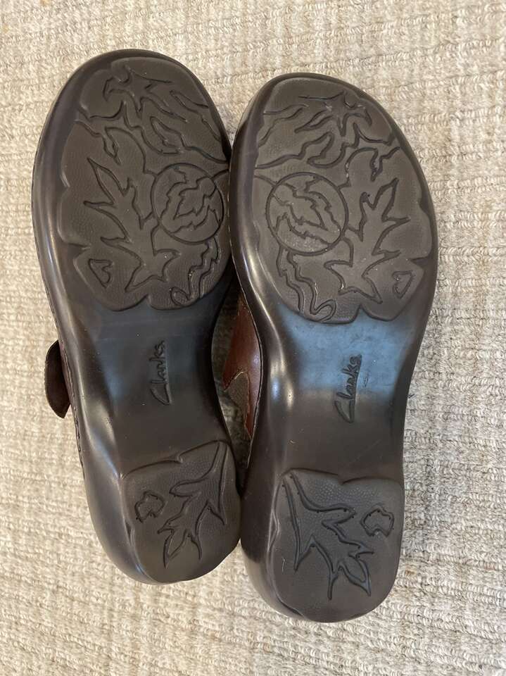 Brown leather upper manmade soul. Size 8M womens. Excellent condition.