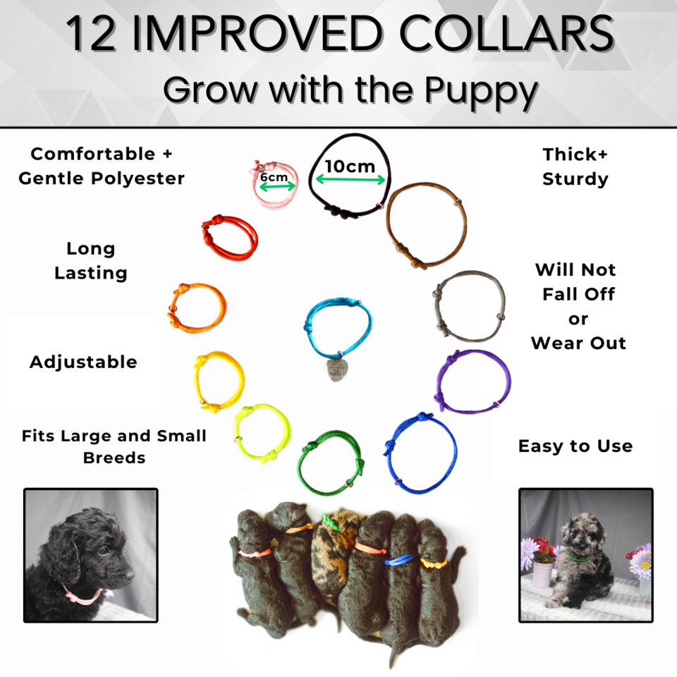 Newborn puppy collars for the litter are upgraded from a simple velcro style to an expandable polyester. The collars are gentle, thick enough to withstand puppy play, easy to use, size adjustable, and do not fall off or wear out. 12 colors allow you to quickly identify individual puppies.