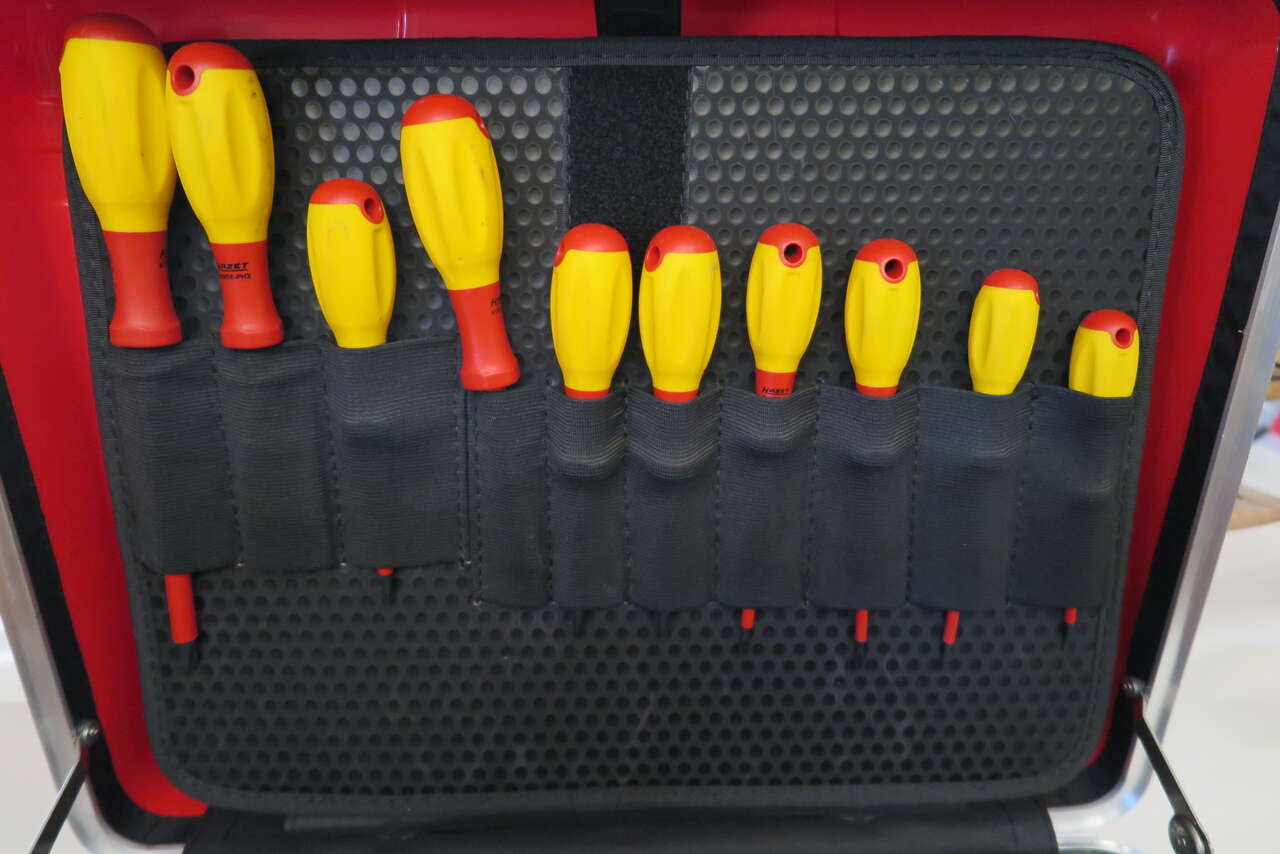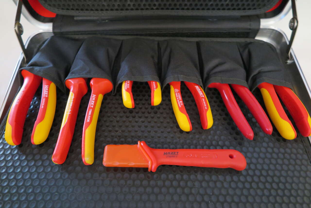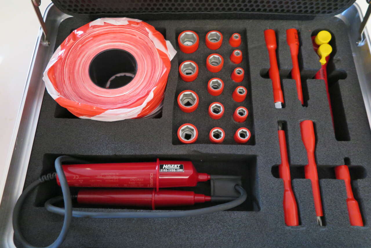 Hazet 150/52 Hybrid and Electric Vehicle High-voltage Tool Set, 52 Pieces, in trolley case Joint development with one of the leading car manufacturer and in accordance with the German TÜV SÜD Surface: with protective insulation (tested to 1,000V) Includes: 196V-10/5 End caps with self clamping ∙ 1000 V (5pcs) 196V-20/5 End caps with self clamping ∙ 1000 V (5pcs) Warning sign “Hybrid” Warning sign “Hybrid switch” Plastic barrier tape ∙ red / white blocked 759N-2VDE Universal pliers 810VDE-T20 Screwdriver for electricians 1804VDE-33 Cable shears 810VDE-25 0.4 x 2.5 mm Screwdriver for electricians 810VDE-PH1 Screwdriver for electrician 810VDE-T25 Screwdriver for electricians 810VDE-PH2 Screwdriver for electricians 810VDE-30 0.5 x 3 mm Screwdriver for electricians 810VDE-T30 Screwdriver for electricians 810VDE-35 Screwdriver for electricians 810VDE-PH3 Screwdriver for electricians 810VDE-40 0.8 x 4 mm Screwdriver for electricians 1802VDE-22 Heavy-duty diagonal cutter 1816VDE-22 Flat nose pliers 1841BVDE-33 Snipe nose pliers 1850VDE-44 Combination pliers 2156VDE-2 Cable stripping knife 8816KV 10 mm (3/8 inch) Reversible ratchet 8821KV-3 10 mm (3/8 inch) Extension 8821KV-5 Extension 10 mm 880KV-6 Socket ∙ hexagon Square 6 mm 8808LG-8KV Screwdriver socket Square M8 8808LG-10KV Screwdriver socket Square M10 8808LG-12KV Screwdriver socket Square M12 880KV-7 Socket 7 mm 880KV-8 Socket 8 mm 880KV-9 Socket 9 mm 880KV-10 Socket 10 mm 880KV-11 Socket 11 mm 880KV-12 Socket 12 mm 880KV-13 Socket 13 mm 880KV-14 Socket 14 mm 880KV-16 Socket 16 mm 880KV-17 Socket 17 mm 880KV-18 Socket 18 mm 880KV-19 Socket 19 mm 880KV-20 Socket 20 mm 880KV-22 Socket 22 mm Voltmeter