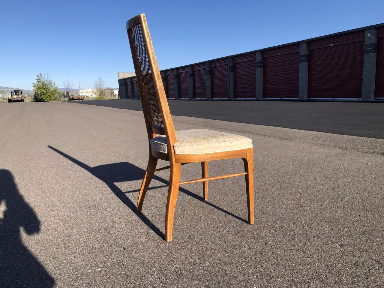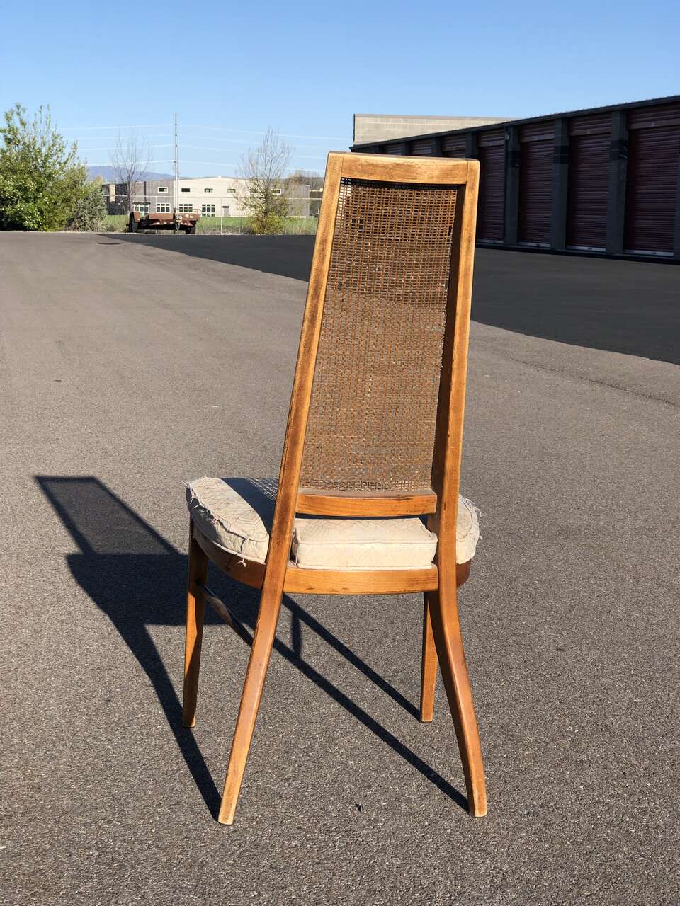 VenmoIconic MCM design. made in USA by Lane. seat needs to be reupholstered and the caning could use a refresh, but the bones are good. Dimensions: 18" seat height and backrest is a glorious 41" tall.