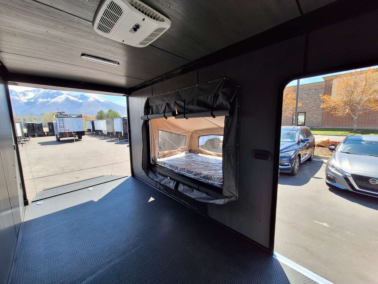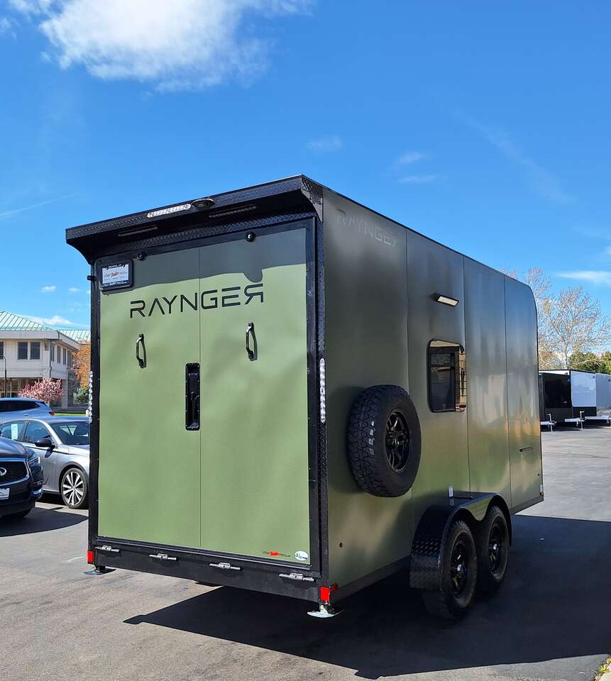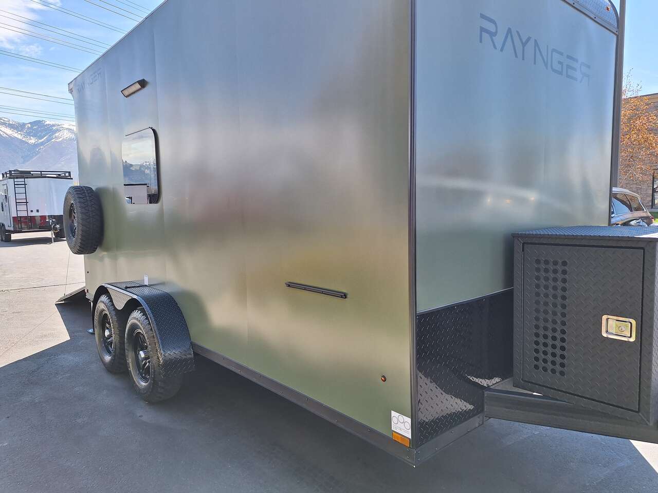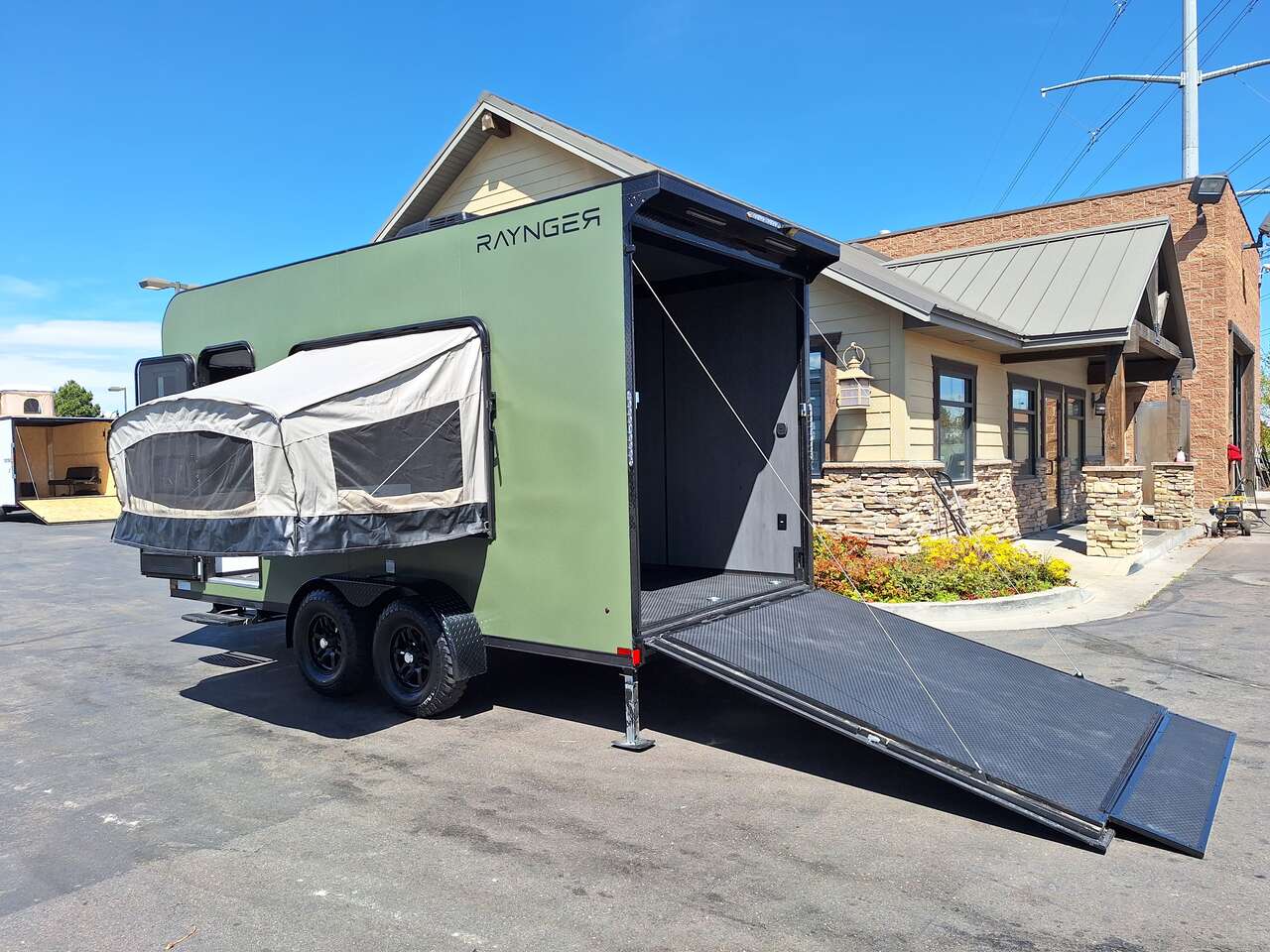 LIMITED TIME $185 A MONTH WITH ZERO DOWN WITH OUR SPECIAL LOCAL CREDIT UNION PARTNER!!! NO PRE-PAYMENT PENALTIES!!! NEW 2025 MODEL!!! FITS ANY STOCK SIDE BY SIDE UTV!!! RAYNGER PREMIUM OFF ROAD TOY HAULER CAMPER!!! 18 INCH GROUND CLEARANCE!!! OFF ROAD TIRES!!! FULLY INSULATED!!! HEATING AND A/C!!! WET SOUND STEREO!!! FOLD OUT/POP OUT TENT WITH MATTRESS!!! 84 Inch Rear Entry Height/87 INCH INTERIOR HEIGHT!!! 77 Inch Rear Entry Width!!! Aluminum Ventilated Locking Generator Box!!! UPGRADED TORSION AXLES!!! 14.2 Foot Long Garage Space!!! And Much MUCH MORE!!! Check out our Specs!!! Also available in 18 foot models. 18 Foot Models can have 3 Fold Out Beds/Pop Out Tents. 16 Foot and 18 Foot Models will fit ANY stock 4 Seater Side by Side • 6” I Beam Frame• Flat Top Design• Flat Front Design• Wall Posts 16” on Center• Cross Members 16” on Center• Roof Bows 16” on Center• Rust Inhibiting Z-Tech Protection on Chassis• Ameraguard on Tongue• Ameraguard on Rear Bumper• Ameraguard Around All Door Openings and Stepwell• Ameraguard Around Edges of Ramp Door• 3500 LB Spring Axles• 2-5/16” Coupler• One-Piece Aluminum Roof• ST235/75R15 Aluminum Wheels with Chrome Center Caps• 2000# Ramp Door with Eberhard Latch• 30” Tempered Glass RV Door with Screen Door• .030 Exterior Metal with Screwless Sides• 24” Black Stoneguard• 3” Black Bottom Trim• Sand Pad• Black Door Hold• 2.7mm Charcoal Textured Vinyl Ceiling • 9mm Charcoal Textured Vinyl Walls• 3/4” Engineered Wood Floor with Rubber Coin Overlay• (6) 1200 LB Floor D rings Installed with Backer Plates• LED Clearance Lights and Tail Lights• LED Back-up Lights• No Show Wheel Box• Spoiler with Toggle Switch• RV Step• 7’ Interior• (2) 17” Chrome Base Lights with Switch• (1) Black 17” Spot Light with Switch• (1) 30 Amp Panel with Marine Plug• A/C Unit with Heat Strip• (3) Interior Recepts• (1) Exterior Recept• 12V Battery and Charge Line• Prep for Backup Camera• Wet Sounds System• (3) Blue Interior Cabinet Lights• (1) 6’ Section of Flex Lights• Black ATP Rear Header and Hoop• Black ATP Fenders• Insulated Walls & Ceiling• Base Cabinets• Overhead Cabinets with Netting Over Compartments• Pop Out Tent• Black ATP Storage/Generator Box Mounted On Tongue SW091696