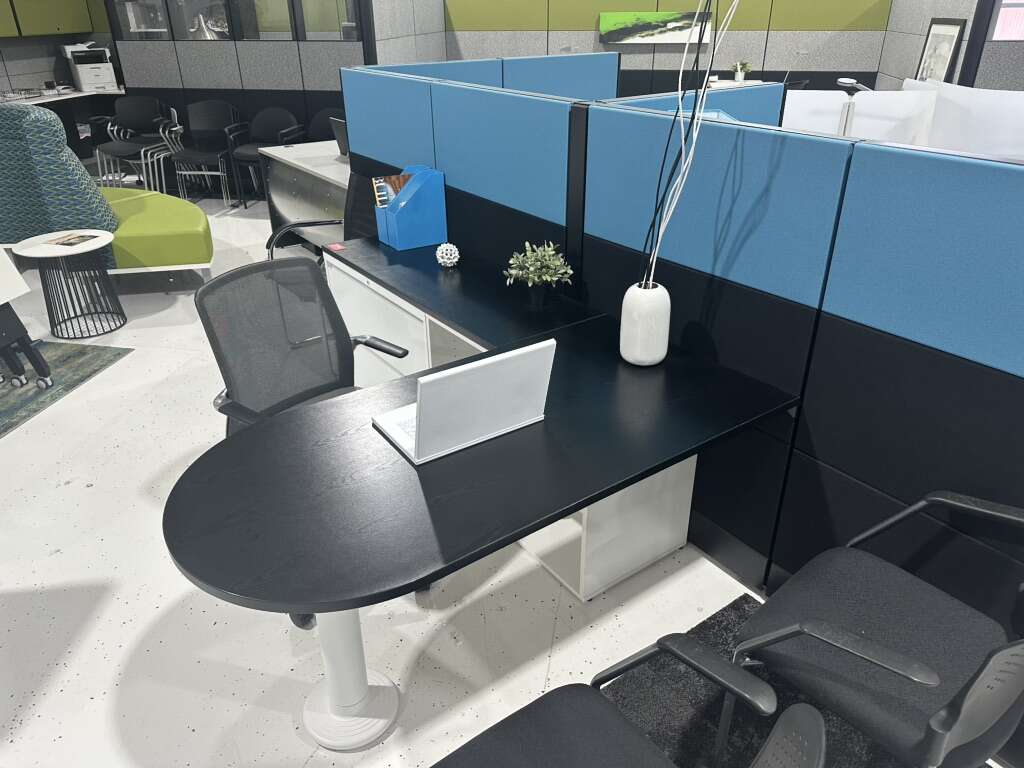 Black and white L- Shaped bullet desk. Showroom model. Never Used!