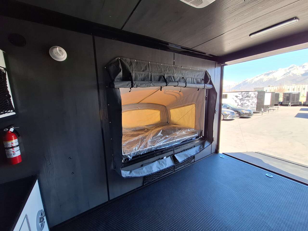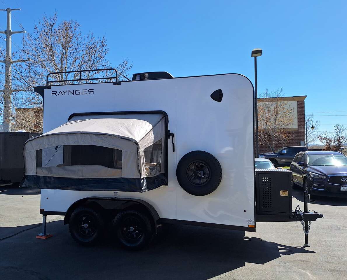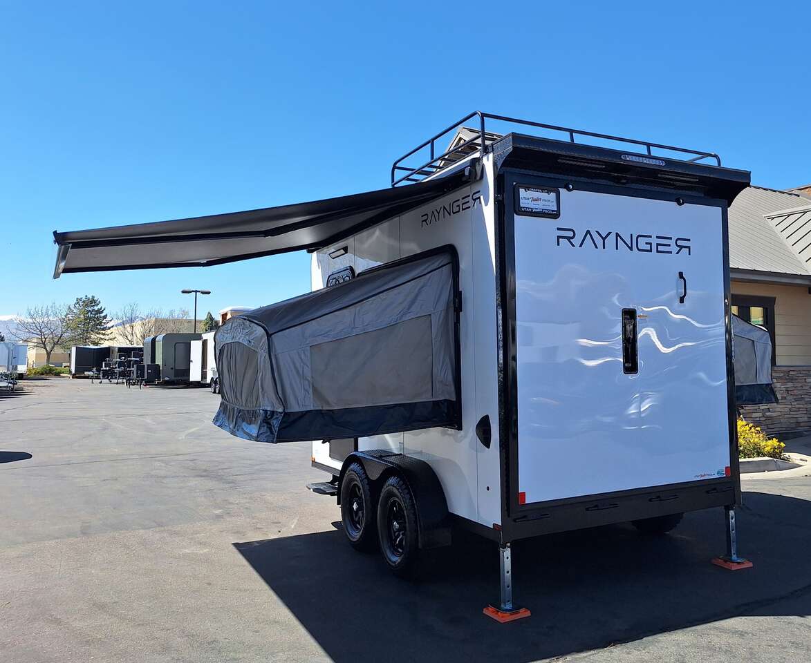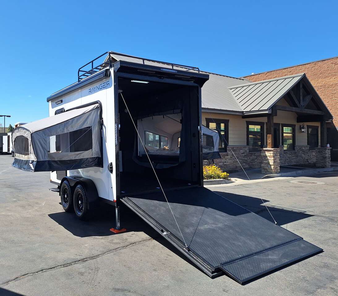 LIMITED TIME $181 A MONTH WITH ZERO DOWN WITH OUR SPECIAL LOCAL CREDIT UNION PARTNER!!! NO PRE-PAYMENT PENALTIES!!! NEW 2025 MODEL!!! RAYNGER PREMIUM OFF ROAD TOY HAULER CAMPER!!! 18 INCH GROUND CLEARANCE!!! OFF ROAD TIRES!!! FULLY INSULATED!!! HEATING AND A/C!!! WET SOUND STEREO!!! TWO FOLD OUT/POP OUT TENTS WITH MATTRESS!!! CARGO BASKET!!! LED LIT AWNING!!! 84 Inch Rear Entry Height/87 INCH INTERIOR HEIGHT!!! 77 Inch Rear Entry Width!!! Aluminum Ventilated Locking Generator Box!!! UPGRADED TORSION AXLES!!! 11.5 Foot Long Garage Space!!! And Much MUCH MORE!!! Check out our Specs!!! Available in 16 foot and 18 foot models. 18 Foot Models can have 3 Fold Out Beds/Pop Out Tents. 16 Foot and 18 Foot Models will fit ANY stock 4 Seater Side by Side • 6” I Beam Frame• Flat Top Design• Flat Front Design• Wall Posts 16” on Center• Cross Members 16” on Center• Roof Bows 16” on Center• Rust Inhibiting Z-Tech Protection on Chassis• Ameraguard on Tongue• Ameraguard on Rear Bumper• Ameraguard Around All Door Openings and Stepwell• Ameraguard Around Edges of Ramp Door• 3500 LB Spring Axles• 2-5/16” Coupler• One-Piece Aluminum Roof• ST235/75R15 Aluminum Wheels with Chrome Center Caps• 2000# Ramp Door with Eberhard Latch• 30” Tempered Glass RV Door with Screen Door• .030 Exterior Metal with Screwless Sides• 24” Black Stoneguard• 3” Black Bottom Trim• Sand Pad• Black Door Hold• 2.7mm Charcoal Textured Vinyl Ceiling • 9mm Charcoal Textured Vinyl Walls• 3/4” Engineered Wood Floor with Rubber Coin Overlay• (6) 1200 LB Floor D rings Installed with Backer Plates• LED Clearance Lights and Tail Lights• LED Back-up Lights• No Show Wheel Box• Spoiler with Toggle Switch• RV Step• 7’ Interior• (2) 17” Chrome Base Lights with Switch• (1) Black 17” Spot Light with Switch• (1) 30 Amp Panel with Marine Plug• A/C Unit with Heat Strip• (3) Interior Recepts• (1) Exterior Recept• 12V Battery and Charge Line• Prep for Backup Camera• Wet Sounds System• (3) Blue Interior Cabinet Lights• (1) 6’ Section of Flex Lights• Black ATP Rear Header and Hoop• Black ATP Fenders• Insulated Walls & Ceiling• Base Cabinets• Overhead Cabinets with Netting Over Compartments• Pop Out Tent• Black ATP Storage/Generator Box Mounted On Tongue SW091694