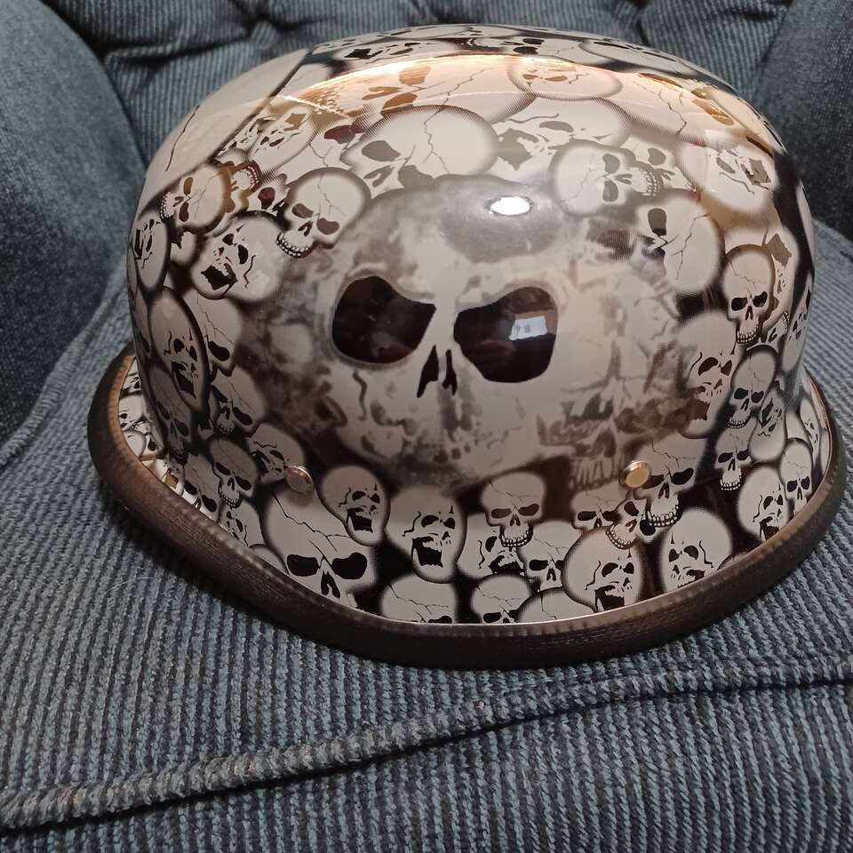 This is a new Novelty German Style Helmet with skulls, like new, size XXL. Great for a bike ride or halloween outfit. Text or call with questions.