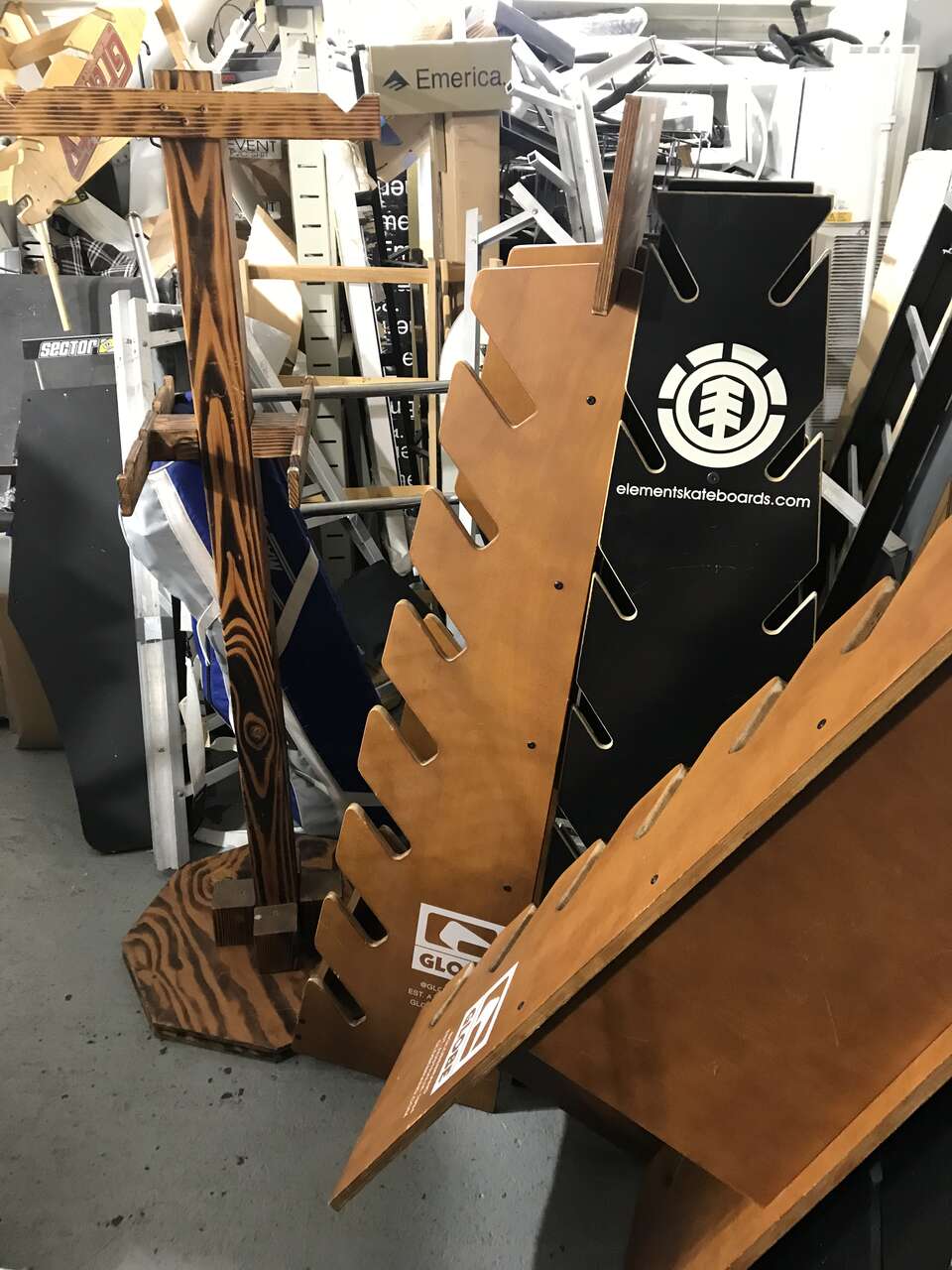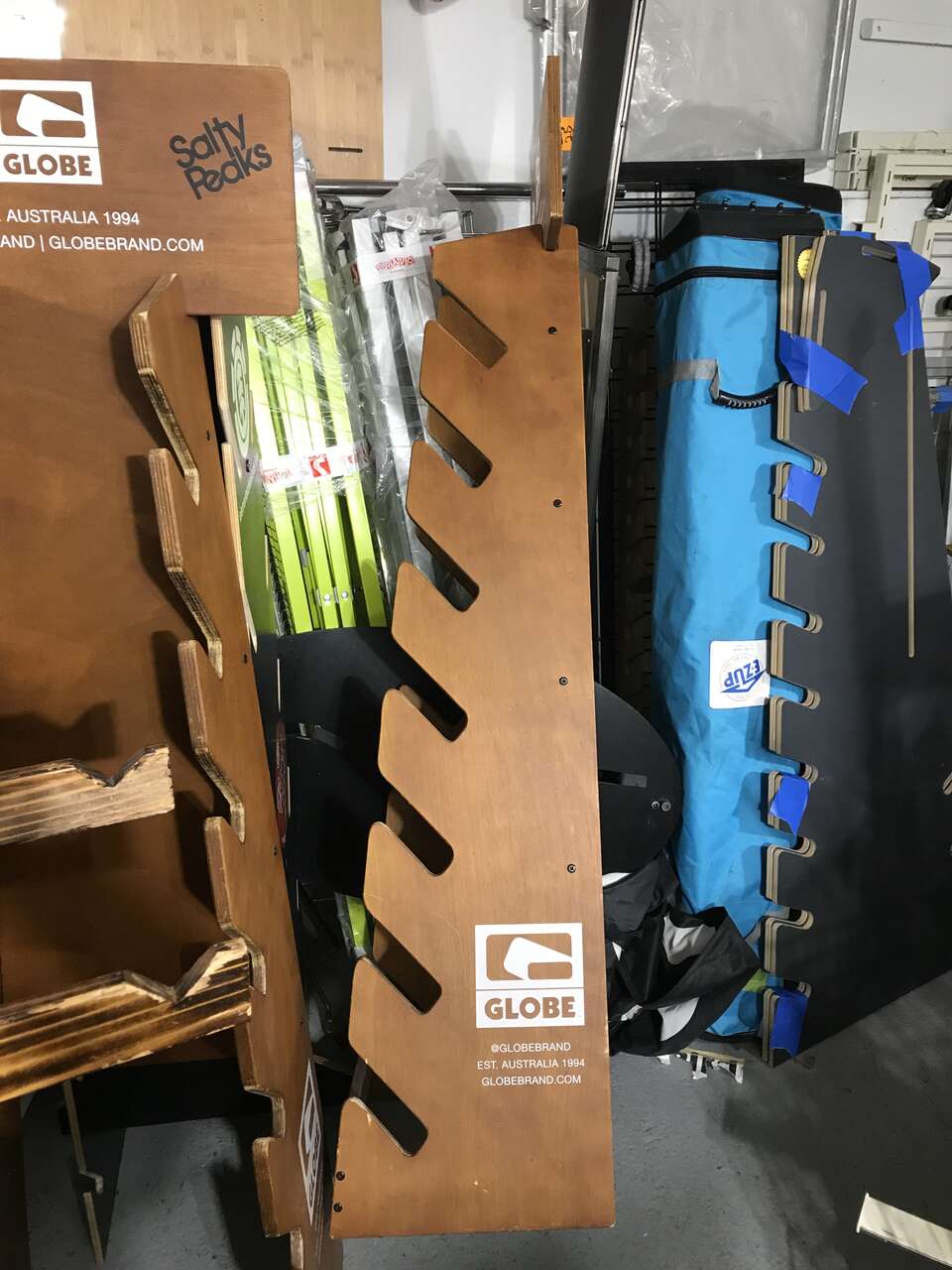 Several skateboard and snowboard racks for sale ranging from the gravity rack And wall mount Racks for $65 to the Arbor orfreestamdimg racks 75 to 100 and rolling Globe racks with shelves and wheels for easy transportation for $150