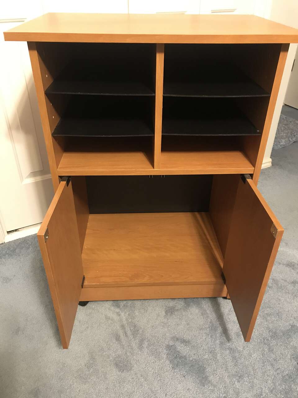 VenmoSTAND ALONE OR USE AS PRINTER, MICROWAVE OR MONITOR STAND. 23.75 inches wide, 16 inches deep and 34 inches tall up on rolling casters. 4 Movable black shelves and 2 Cupboard magnetic closing doors. $45 Cash/Venmo. In Sandy. 801-201-5350