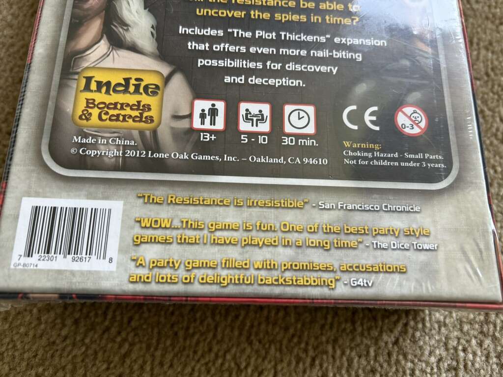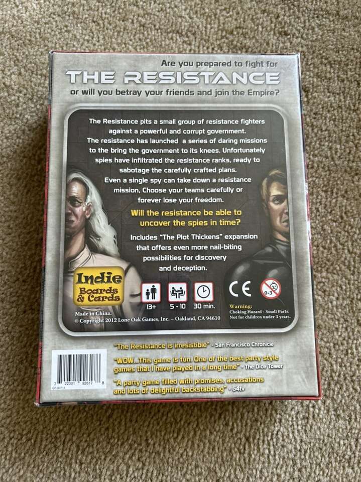 NEW (sealed in plastic) The Resistance Game: Secret Identities, Deduction, Deception. By Don Eskridge, Indie Boards & Cards, 2012. Ages 13+, 5-10 players. New, unopened condition. Text only. Cash or Venmo.