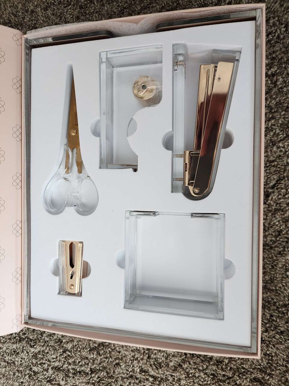 VenmoThis is a brand new in box Salt by Sabrina Acrylic Gold office organizer set. This comes with the separate matching pen holder as well. These are high quality and are packaged beautifully and well. I have multiple available in both gold and silver. I also have some other Salt by Sabrina white jewelry/storage boxes available. Mother’s Day Special: BUY 2 sets GET 1 set FREE. It would make a great gift. We will take cash or Venmo. Elevate your office with the Salt Office Essentials Bundle, featuring premium acrylic products to give your workspace the perfect balance of organization and aesthetic. Our Office Gift Set is made of premium acrylic and offered in Classic Gold and Polished Silver. From the weight of the ball that holds your tape to the beautiful shape of the acrylic handles on the scissors, each piece was created with attention to the smallest details. The Acrylic Pen Holder is crafted with intention to elevate your desk space while helping you keep your go-to writing utensils close at hand. Match your pen holder to your office gift set with the options of a silver or gold bottom.