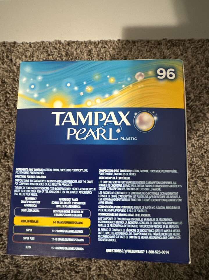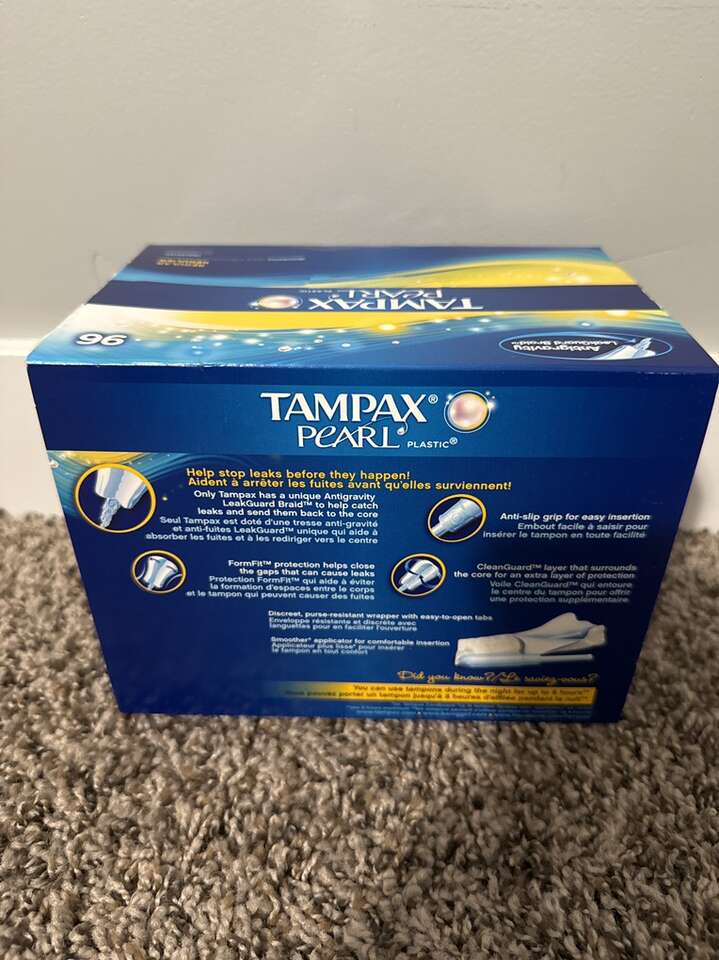 Brand new box never opened of 96 Tampax Pearl Regular tampons. Smoke/Pet free home.