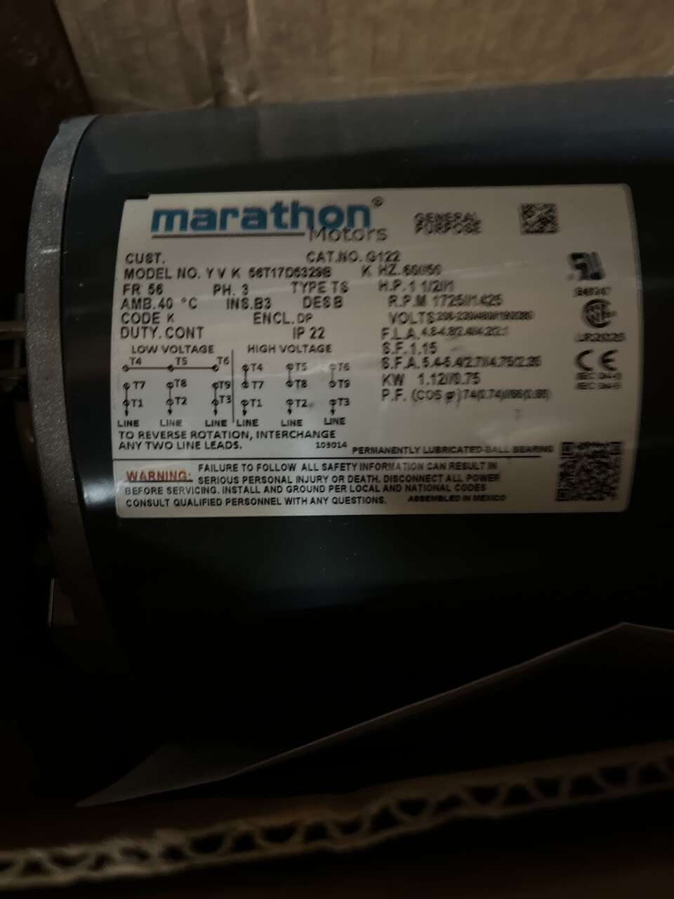 This is a new Marathon motor Cat No. G122. It is 3 phase, 1725 RPM. It sells for over $200 on-line (see last photo). I'm selling this motor for $25.