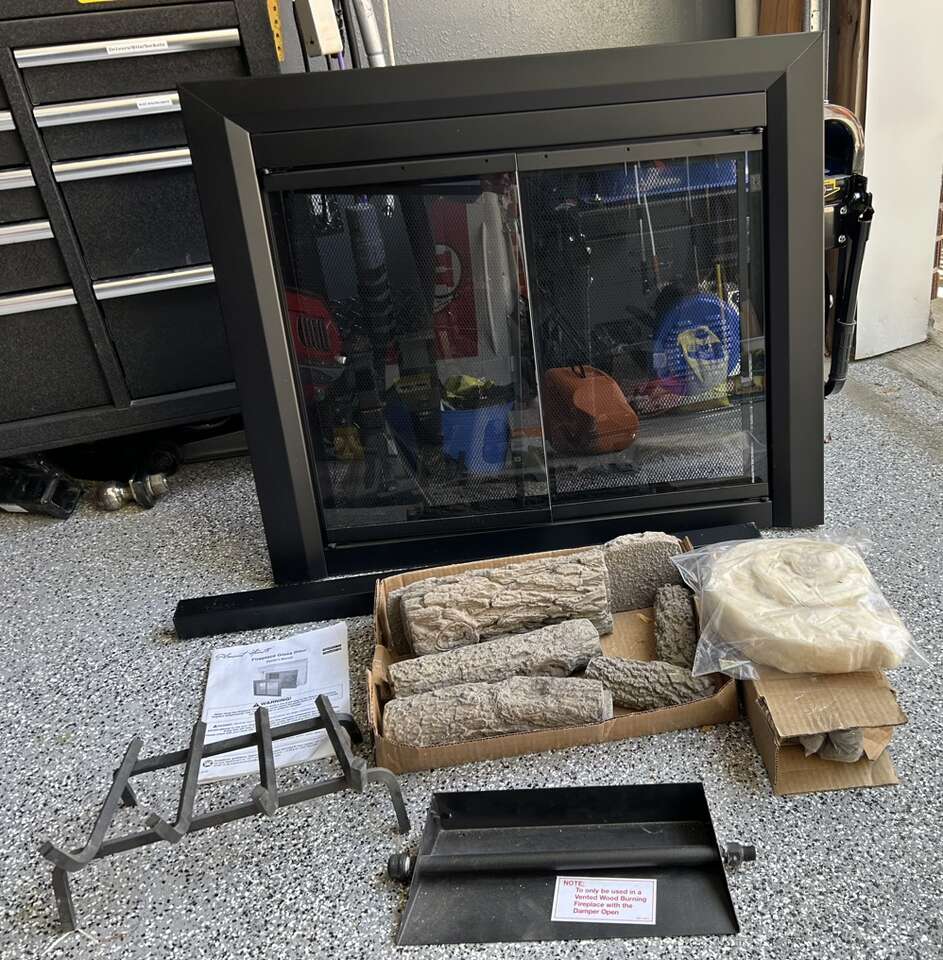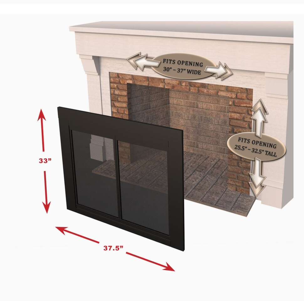 Dimensions: 37 ½ W x 33 H Fits Opening Width: 30 ~ 37 || Fits Opening Height: 25 ½ ~ 32 ½ Black Finish with Smoked Glass Premium/Fine Mesh Panel. Beveled frame Cabinet style doors 5-Incheasy grip handles Doors open completely for a full view of the fireplace
