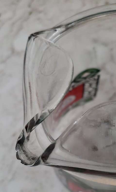 2 qt with room for ice too. Has a chip out of tip of pouring spout . Otherwise in great condition.