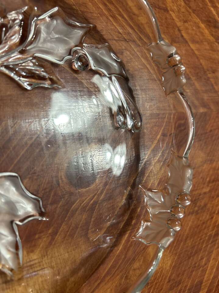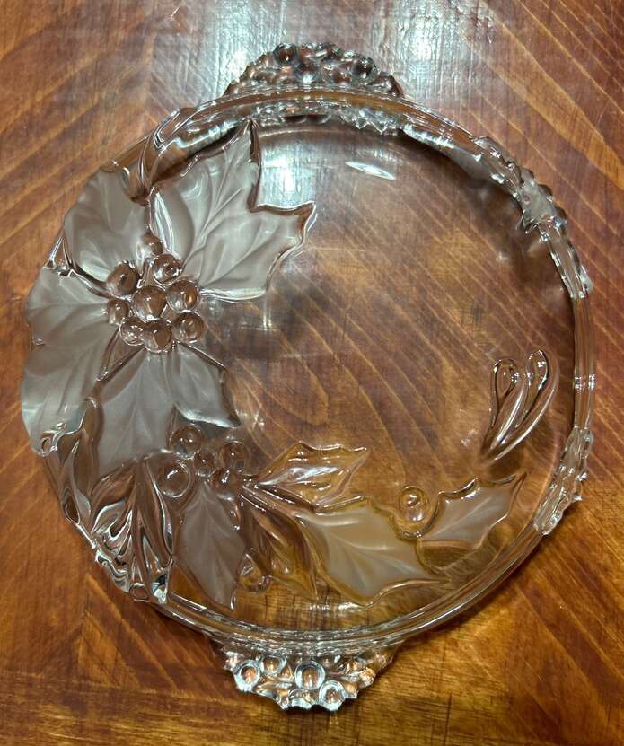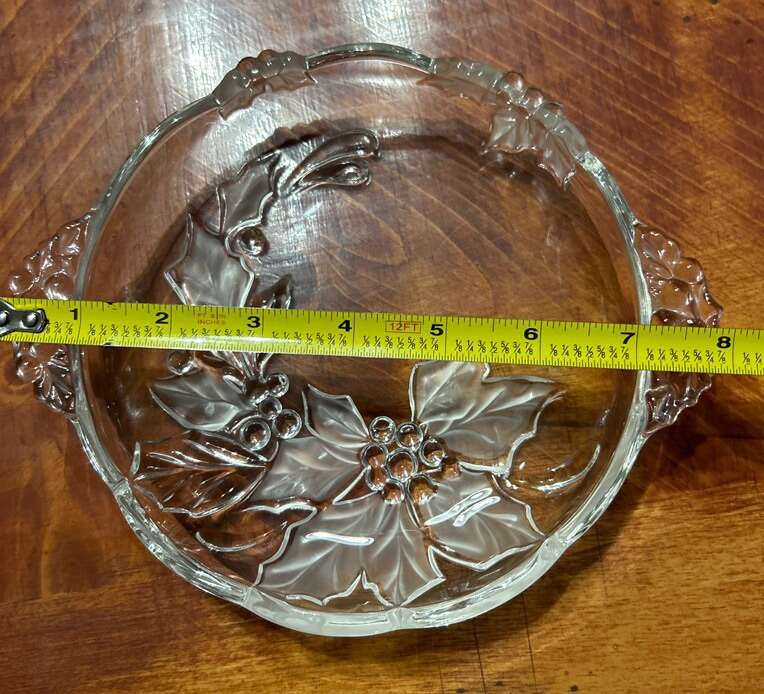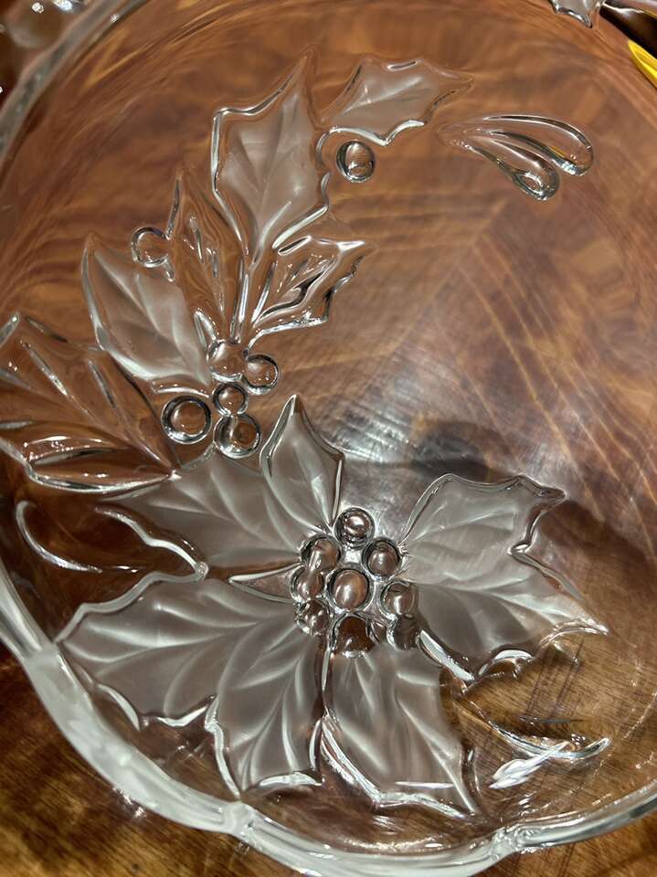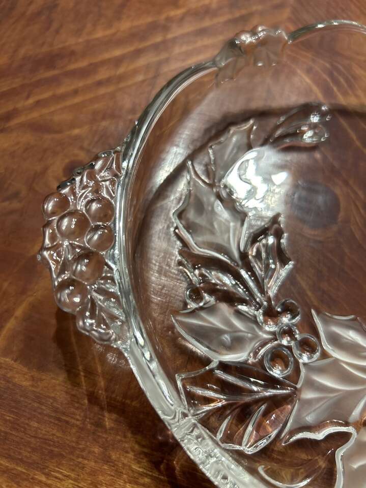 VenmoVintage Mikasa Crystal serving platter, Candy dish or shallow bowl. Has a festive poinsettia pattern and convenient handles for serving cheese or candy. 8 in wide with Handles included. The round shape and clear color highlight the intricate design, while the high-quality crystal material ensures durability. Perfect for holiday gatherings or special occasions. Part of my fundraiser! Thanks for looking! PU in Woods Cross