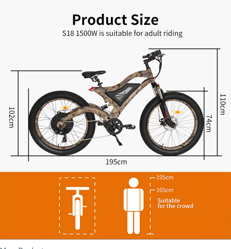 VenmoNew, in box. Model S-18, 48V, 1500W, 14AH, 31-43.5 mile range, Max speed 27MPH, Snake skin wrapped E-Bike. Battery: 48V 15Ah lithium battery Frame: Aluminum frame Brakes: F/R Mechanical Brake Display:Color-LCD Tires: 26x4.0 inch Max speed: 27 mp/h Fork: Al alloy suspension fork Derailleur: SHIMANO 7 speed Saddle Height:88-100cm Charge Time: 4-6 hours Weight Capacity:300 LB