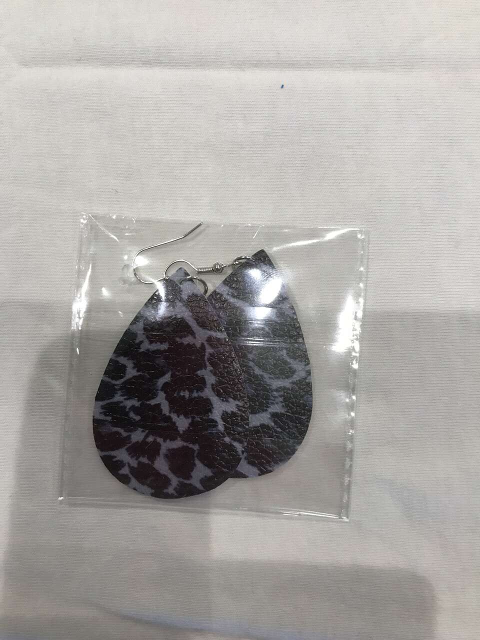Leopard Print design Earrings. The colors are blue and black and they are BRAND NEW! They are two inches in length and they are in their original packaging.