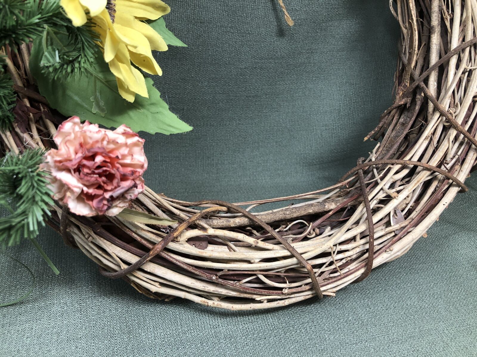 VenmoBrighten up your space with this charming sunflower and grapevine wicker wreath. It measures 16" the perfect size for any door! Crafted with a rustic grapevine base, it features vibrant yellow sunflowers and greenery for a warm, welcoming look. Perfect for hanging on your front door, wall, or above a mantel, this wreath captures the beauty of late summer and fall with a timeless farmhouse touch.