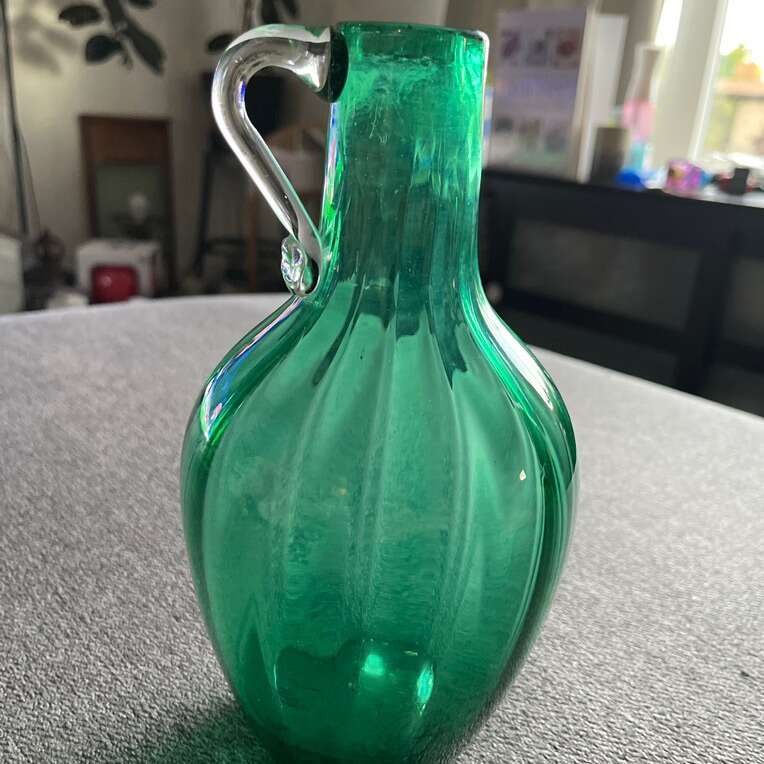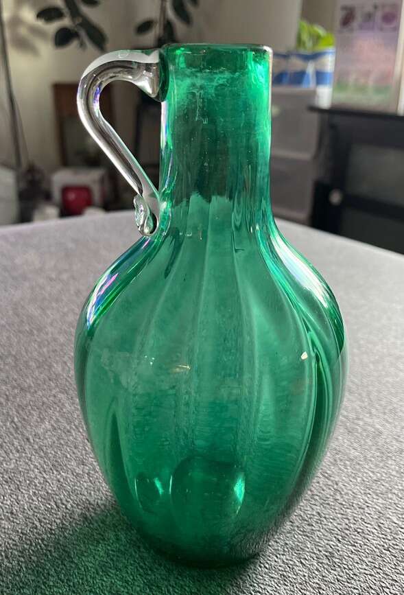 Vintage Bischoff Art Glass Green Pitcher Jug, $10. Year 1952, art deco MCM