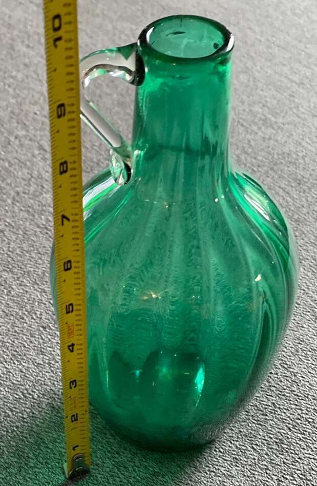 Rare Vintage Bischoff Art Glass Pitcher Emerald Green with ribbed texture • Tall & Thin spout • Beautiful Clear Glass handle • About 8.5H • In excellent vintage condition! • No chips scratches, or cracks