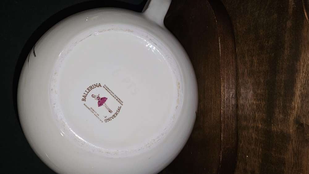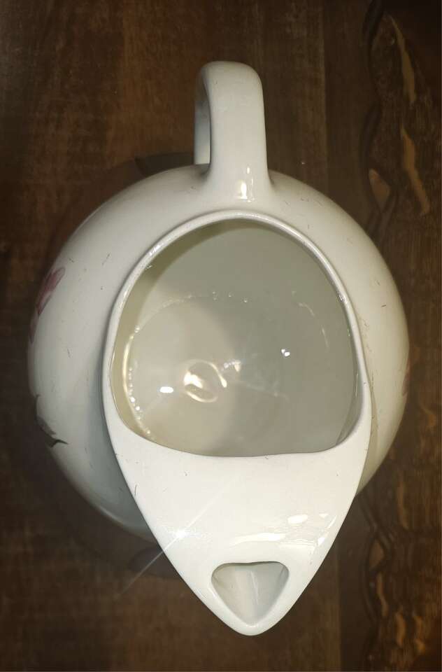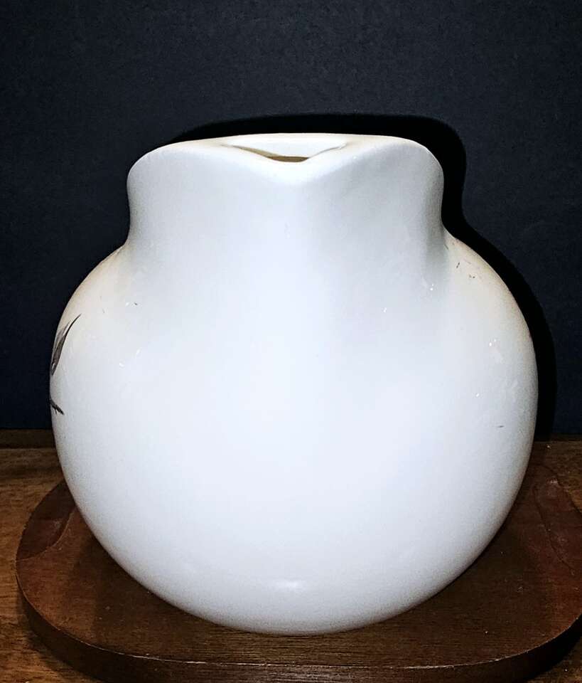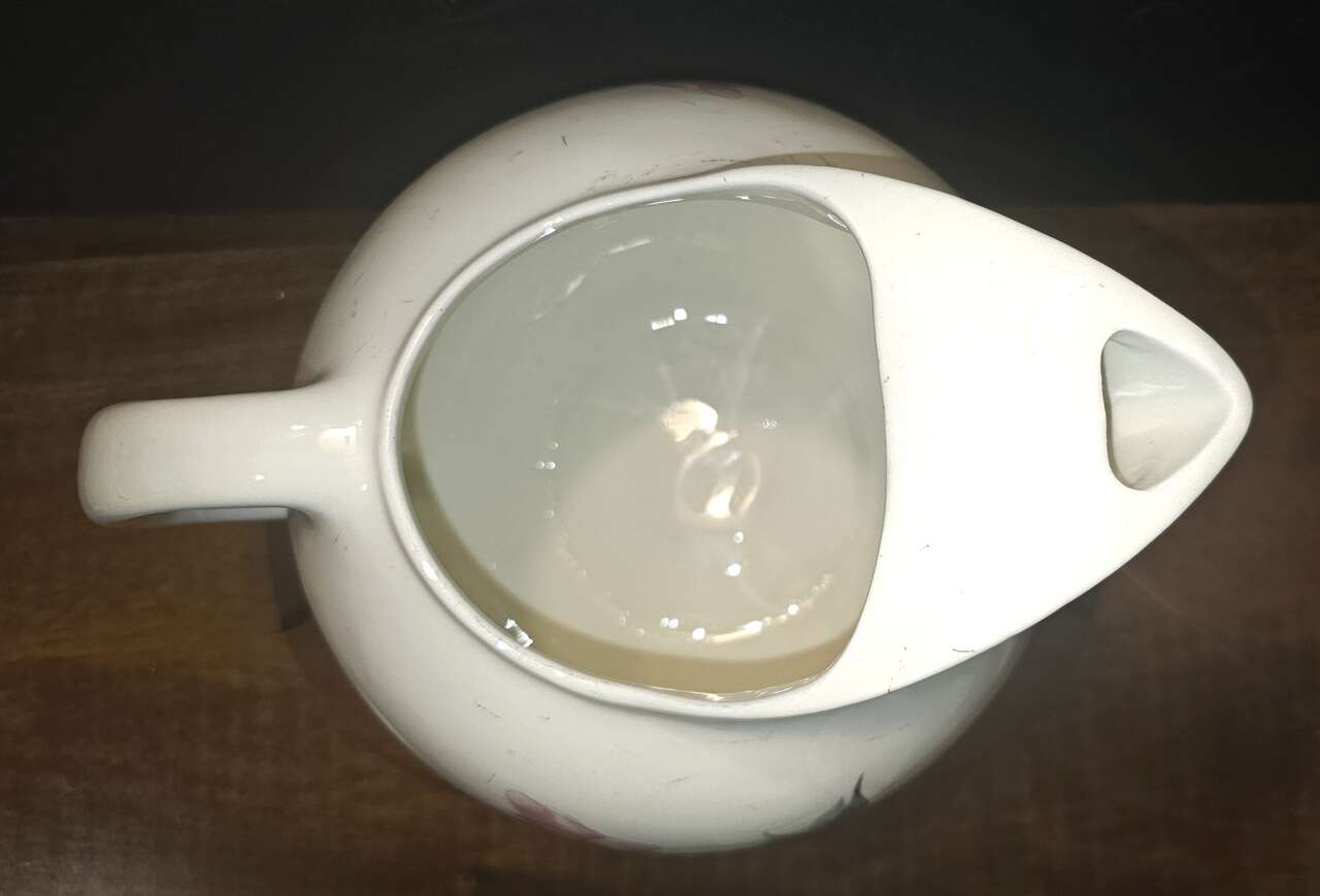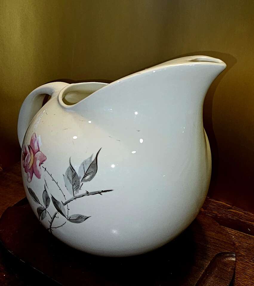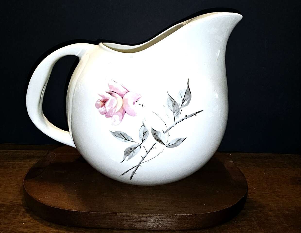 Beautiful, single, delicate, soft pink rose on a curved limb with sage gray leaves on a white background. This pattern and shape of this larger 64 oz. pottery pitcher is absolutely gorgeous and in pristine condition.