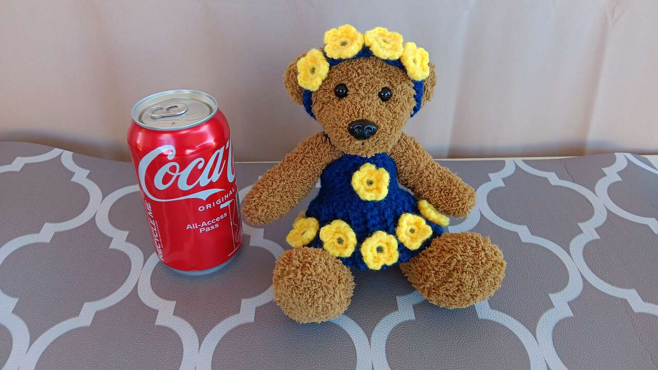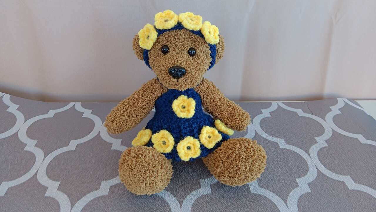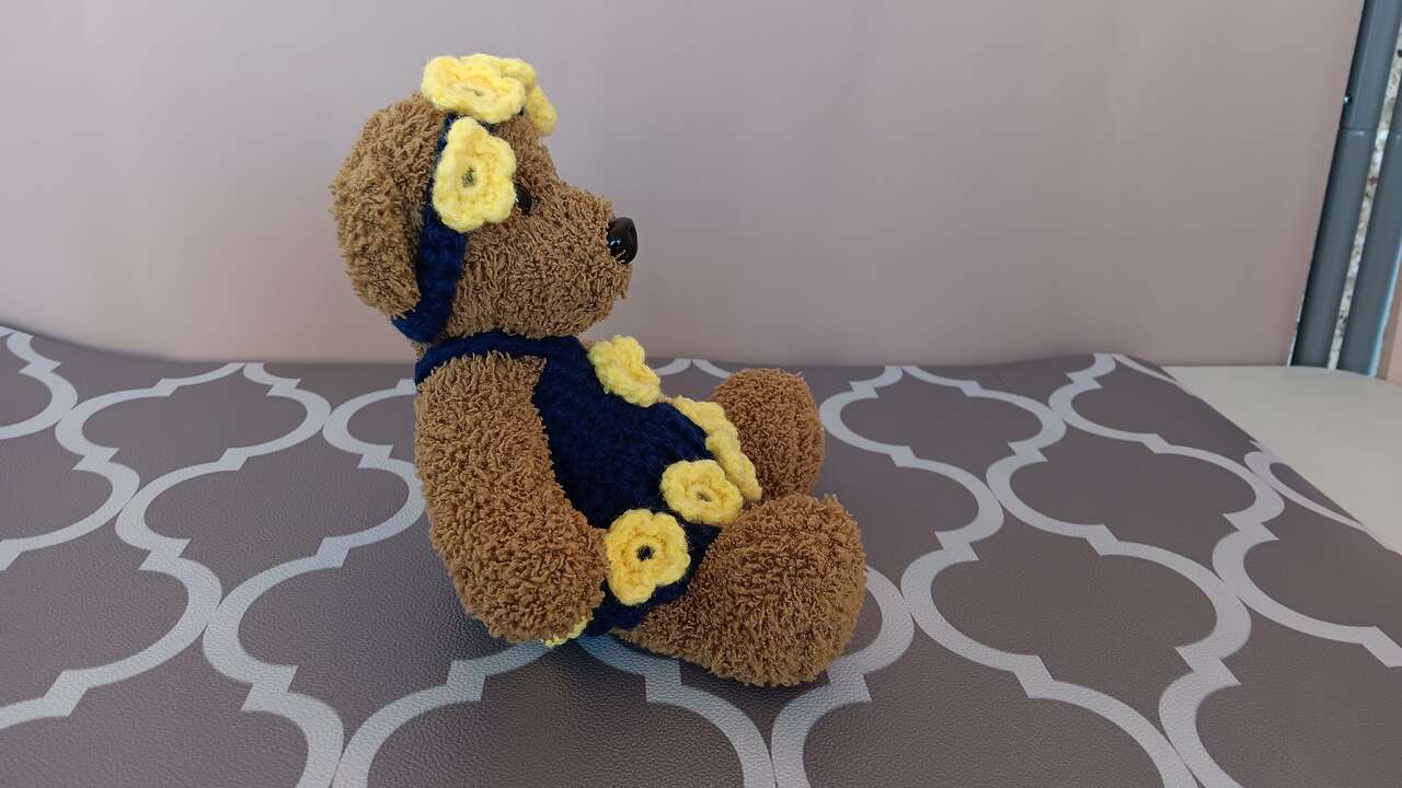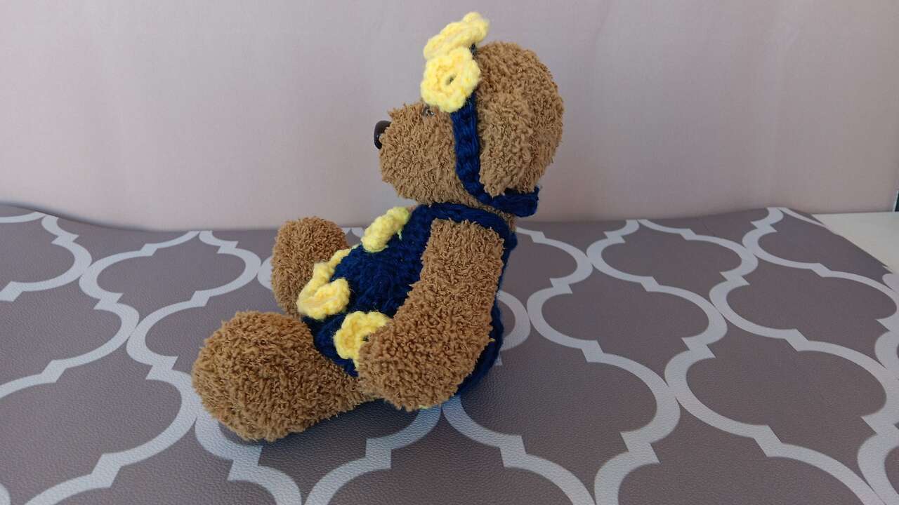 “Daisy”- Brighten your day with this six inch sitting bear, dressed in a navy blue handmade outfit accented with yellow flowers. Each bear has its own unique outfit (no patterns used) and personality. All new materials. Made for decorative purposes (some pieces may pose choking hazard to children). Please mention “Daisy” when contacting for purchase, as we have other bears for sale.