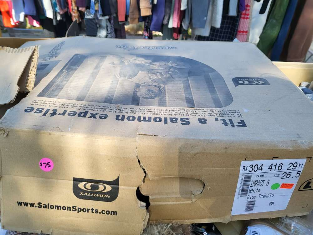 Salomon snow ski boots for sale. My husband wore them one time only and that was it. He bought them several years ago before Sports Chalet went out of business and they've been sitting unused for a long time. Men's blue and white snow ski boots were on sale for $290, asking $75. Men's size 8.5.