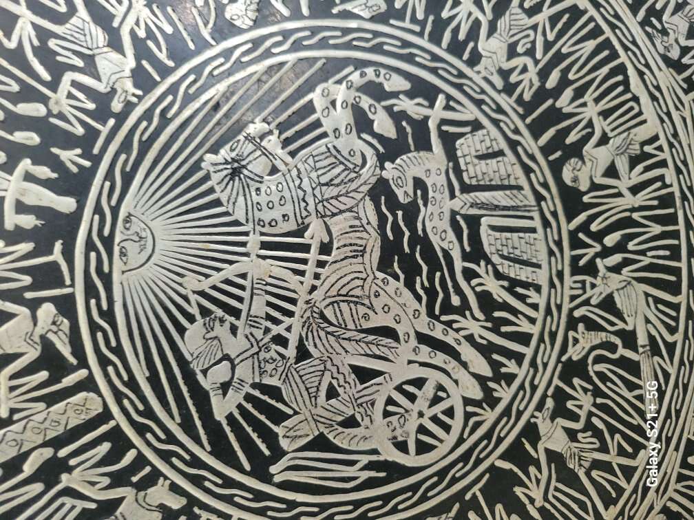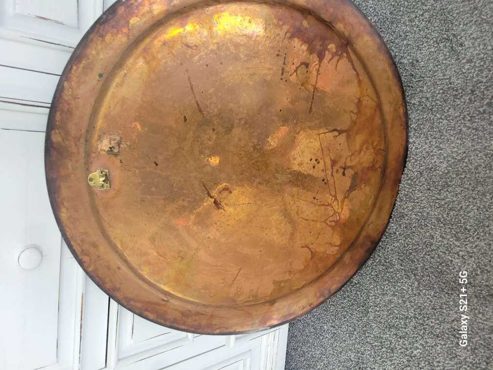 Amazing large hanging Egyptian Charger or tray with brass, copper, and silver overlay. Vintage from the 1950's. 27.5" round.