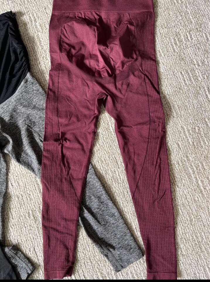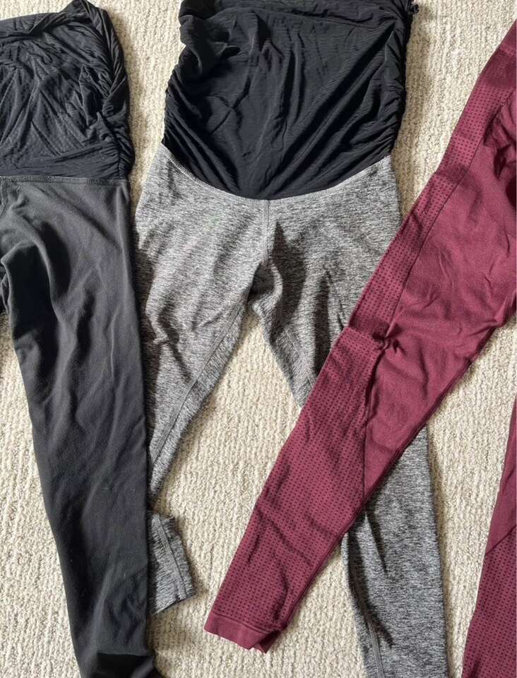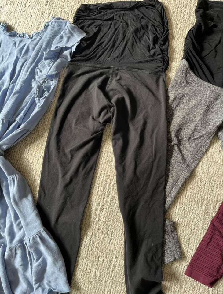 $20 for all. Two pairs of beyond yoga “beyond the bump” maternity leggings size XS. One pair of maroon colored maternity leggings size small, unknown brand. One dress size small. Not specifically maternity, but it worked for a maternity dress. All are in decent preowned condition. The black beyond yoga leggings show the most wear with some pilling throughout, but still life left.