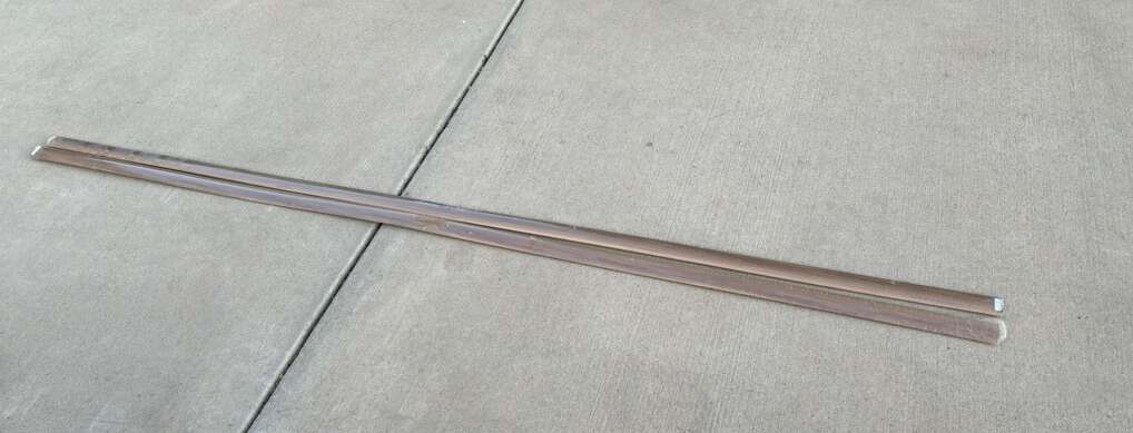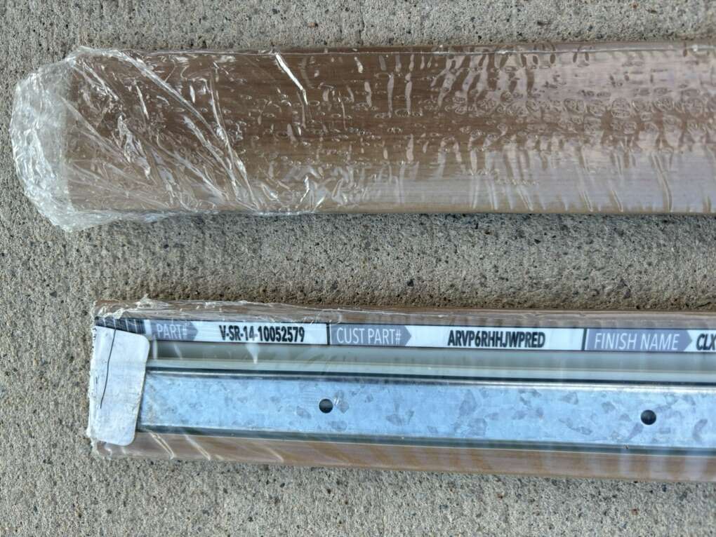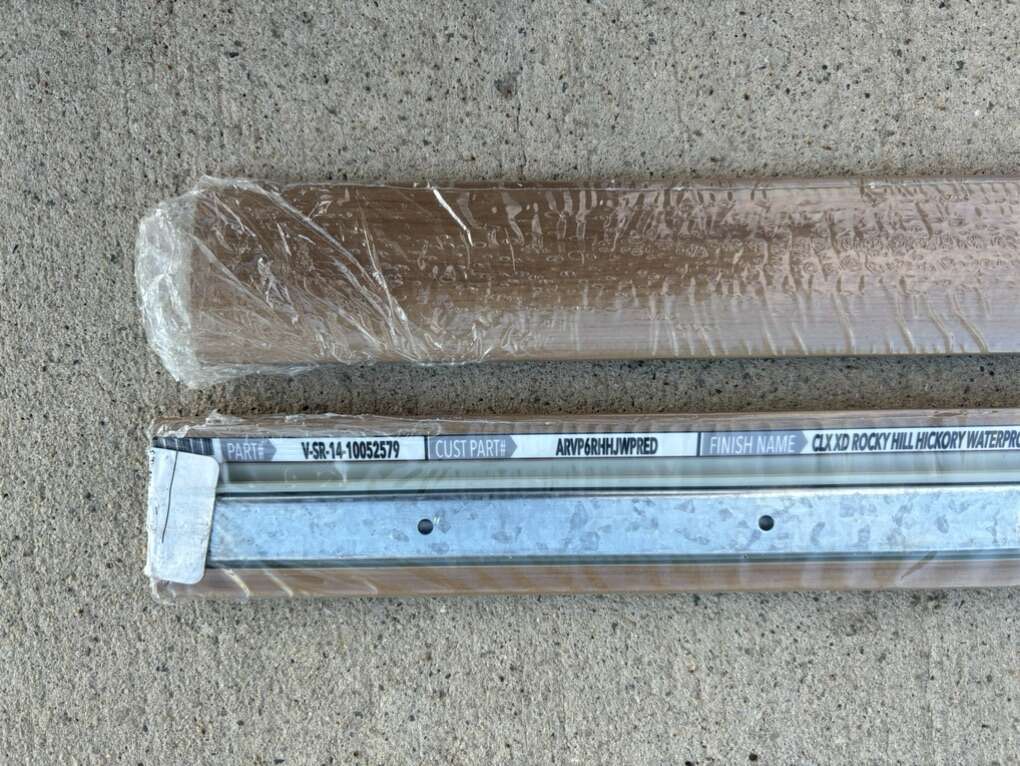 Description- 188” (two 94” pieces) Waterproof vinyl flooring, transition pieces with mounting installation tracks. See photos for more product information and specifications.