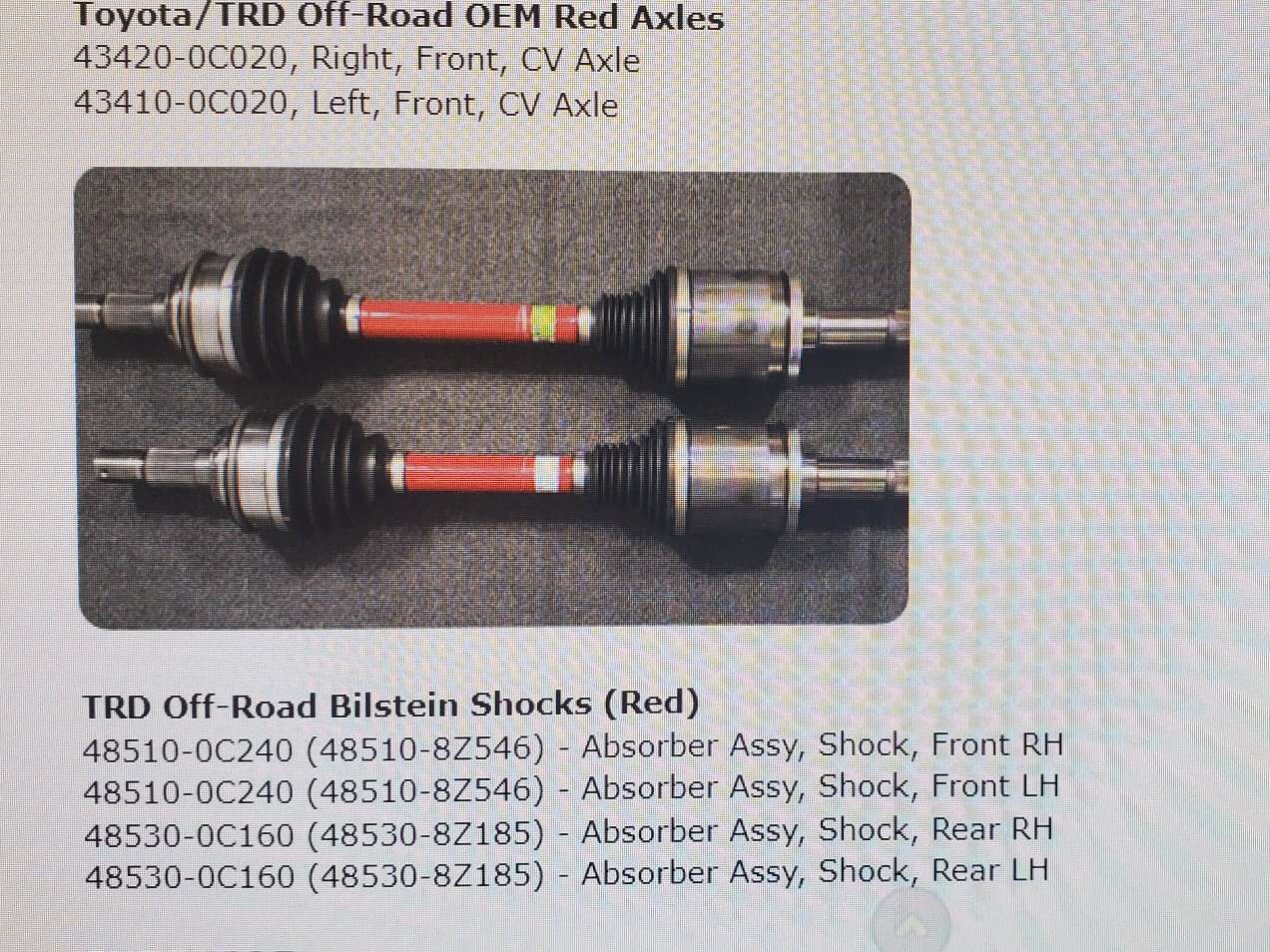 Front Red Shocks: $100 w/springs Rear Red Shocks: $50 Red Axles: $400