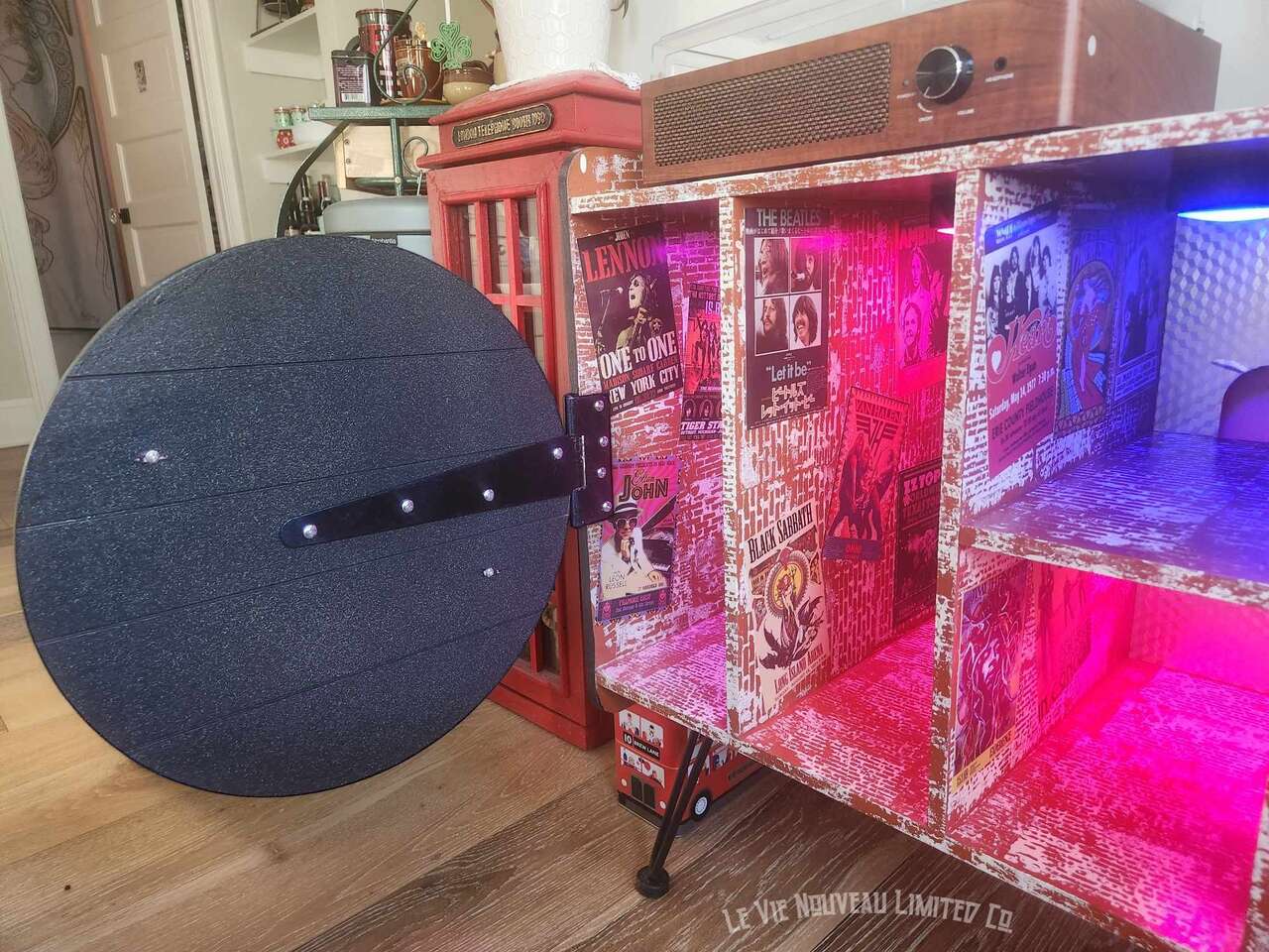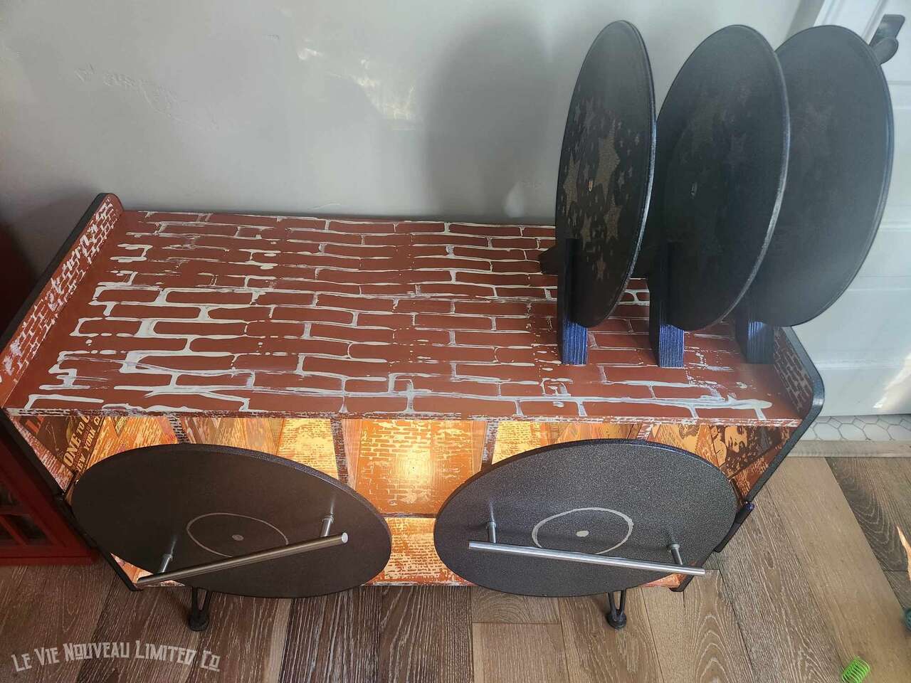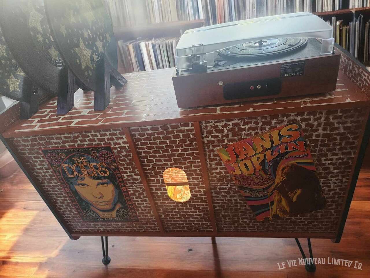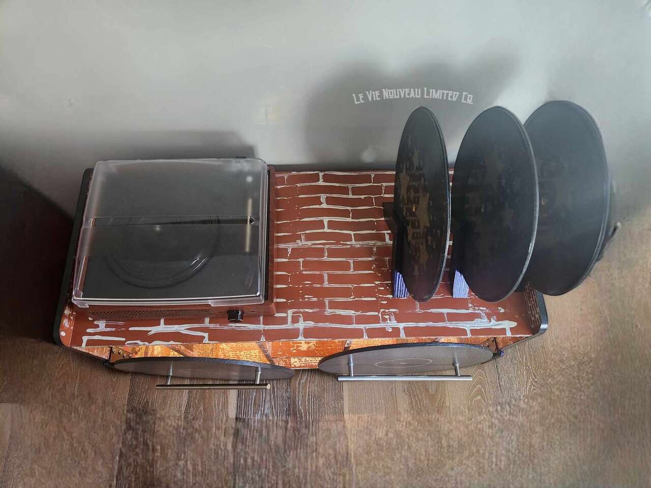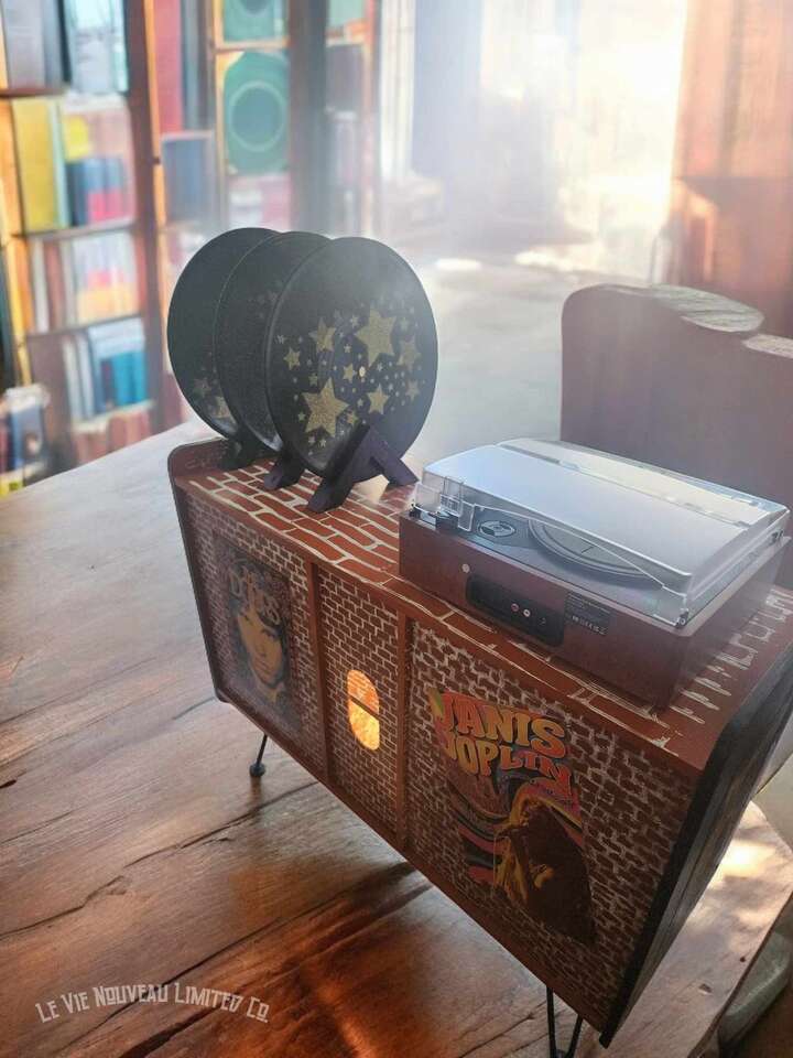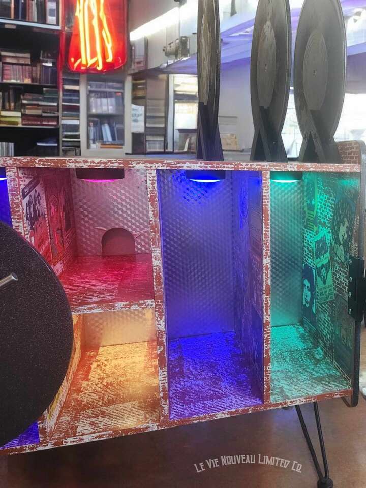 33.1" Long, 26" Height, 13.6" Width. Approx. 45 lbs. Hand-painted brick with holographic paint gives the record doors and shelves a retro shimmer. Mini vintage classic rock concert poster art that has been decoupaged onto the brick walls gives a one-of-a-kind look to your vinyl record storage space! Shelves hold 200 albums measuring 12" square standard vinyl record size, with storage on top shelf for your vinyl record player plus additional albums between the custom-made vinyl record decorative dividers. Not only great for record players and vinyl, but also sound equipment, decorative pieces, and books as an end-table. Includes a wire hole in back through which you can easily connect to your power supply. Has metal legs fitted with rubber protective pads under them to protect your floor from metal scratches. Comes fully assembled, including 6 Wireless LED Color-Changing Puck Lights Battery Operated w/Remote Control Timer Function Under Cabinet Lighting. There are no returns or exchanges for our furniture pieces. Please request additional photos if needed. Local pickup is available in Salt Lake City, UT. www.lavienouveaudecorshoppe.com Follow us on Instagram! https://www.instagram.com/la_vie_nouveau_decor_shoppe/