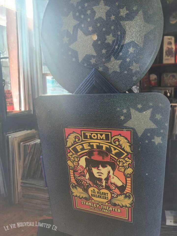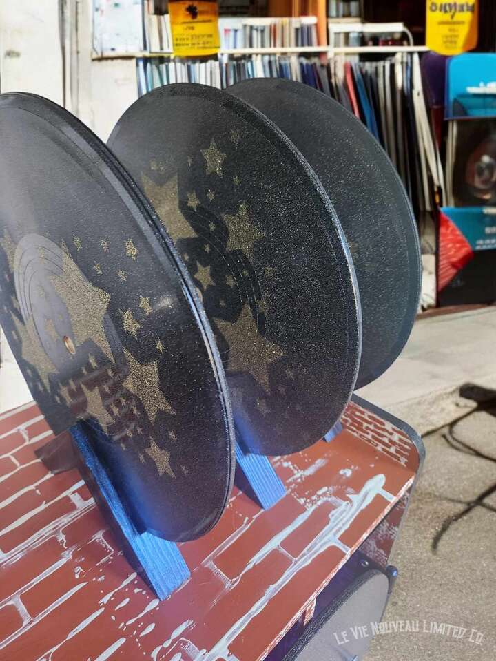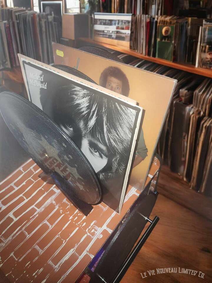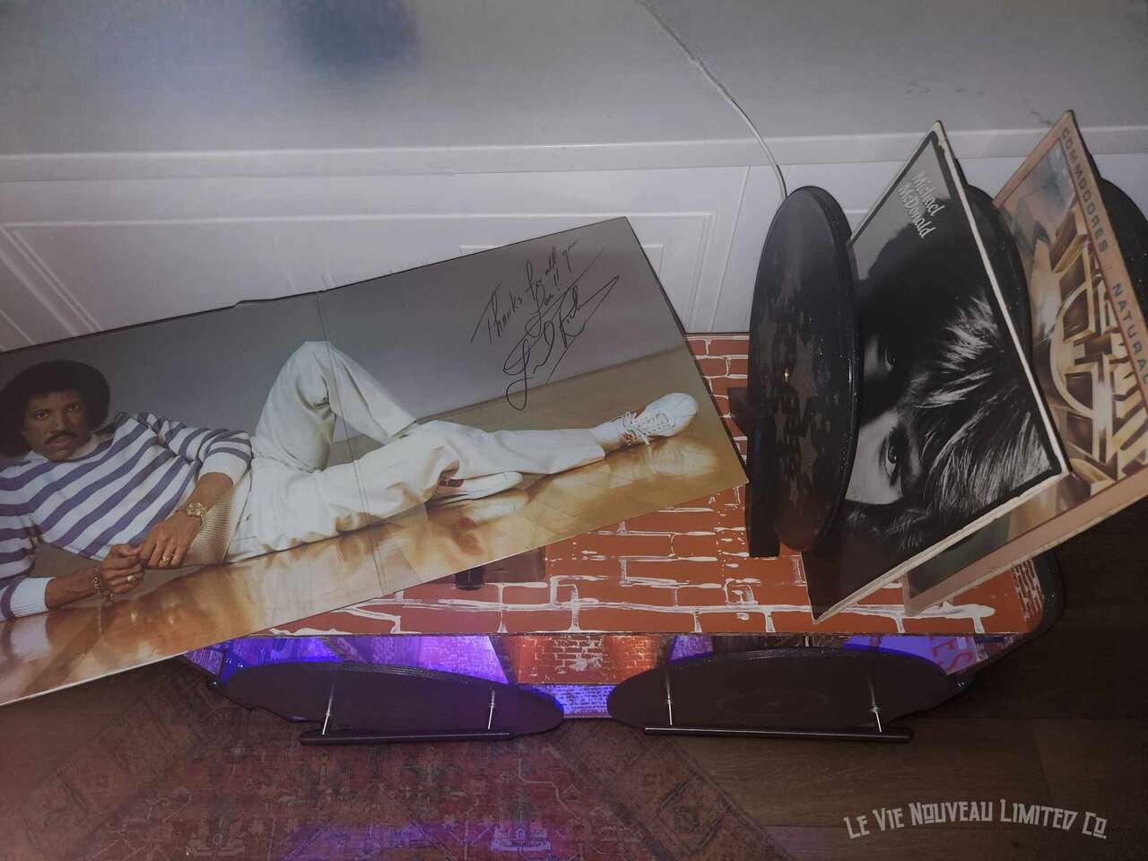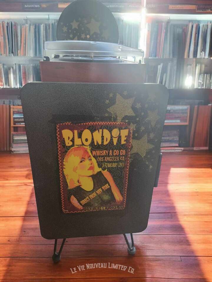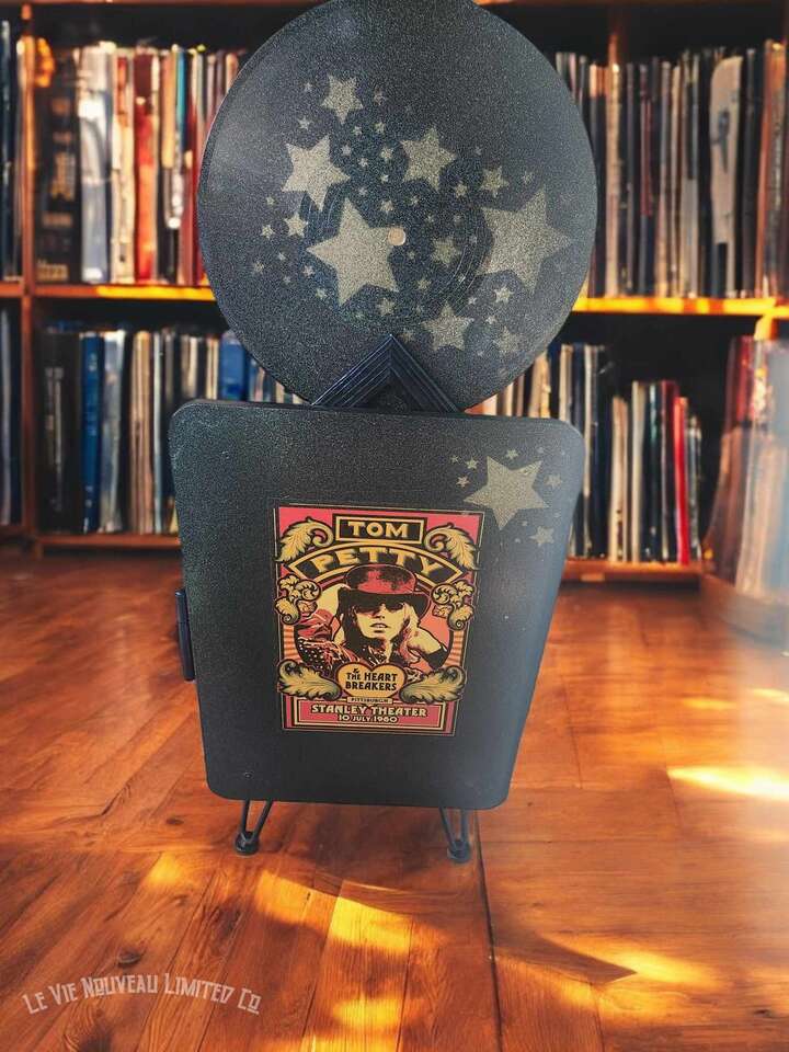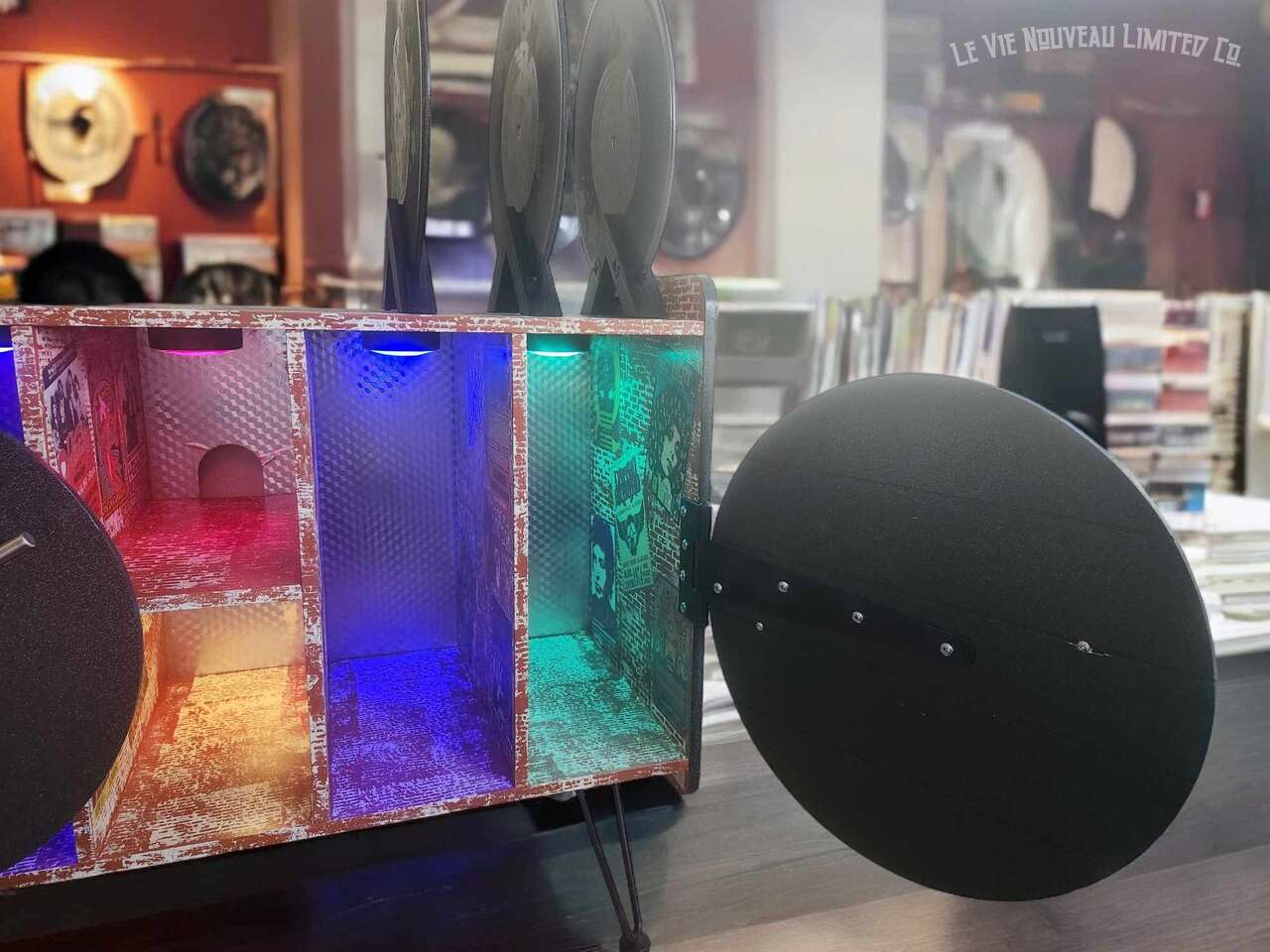33.1" Long, 26" Height, 13.6" Width. Approx. 45 lbs. Hand-painted brick with holographic paint gives the record doors and shelves a retro shimmer. Mini vintage classic rock concert poster art that has been decoupaged onto the brick walls gives a one-of-a-kind look to your vinyl record storage space! Shelves hold 200 albums measuring 12" square standard vinyl record size, with storage on top shelf for your vinyl record player plus additional albums between the custom-made vinyl record decorative dividers. Not only great for record players and vinyl, but also sound equipment, decorative pieces, and books as an end-table. Includes a wire hole in back through which you can easily connect to your power supply. Has metal legs fitted with rubber protective pads under them to protect your floor from metal scratches. Comes fully assembled, including 6 Wireless LED Color-Changing Puck Lights Battery Operated w/Remote Control Timer Function Under Cabinet Lighting. There are no returns or exchanges for our furniture pieces. Please request additional photos if needed. Local pickup is available in Salt Lake City, UT. www.lavienouveaudecorshoppe.com Follow us on Instagram! https://www.instagram.com/la_vie_nouveau_decor_shoppe/