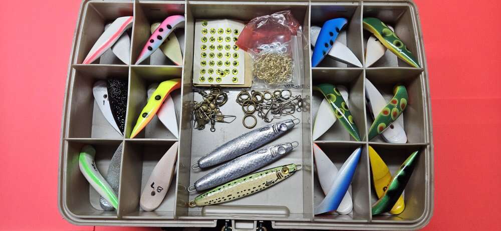 24 LURES. Hooks, swivels, eyelets, and circle connectors. 3 LEAD long fish (one painted) 2 not. Carrying case included. $50.00 for the lot. Ogden area.