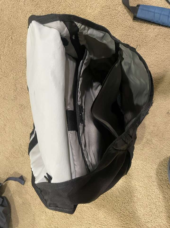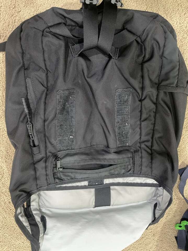 This is a medium, nylon Timbuk2 custom color backpack. Includes pockets for small items in the front, a padded laptop sleeve that easily fits a 13” laptop. You can also access the main compartment from a side zipper. This is a good school or everyday use backpack.