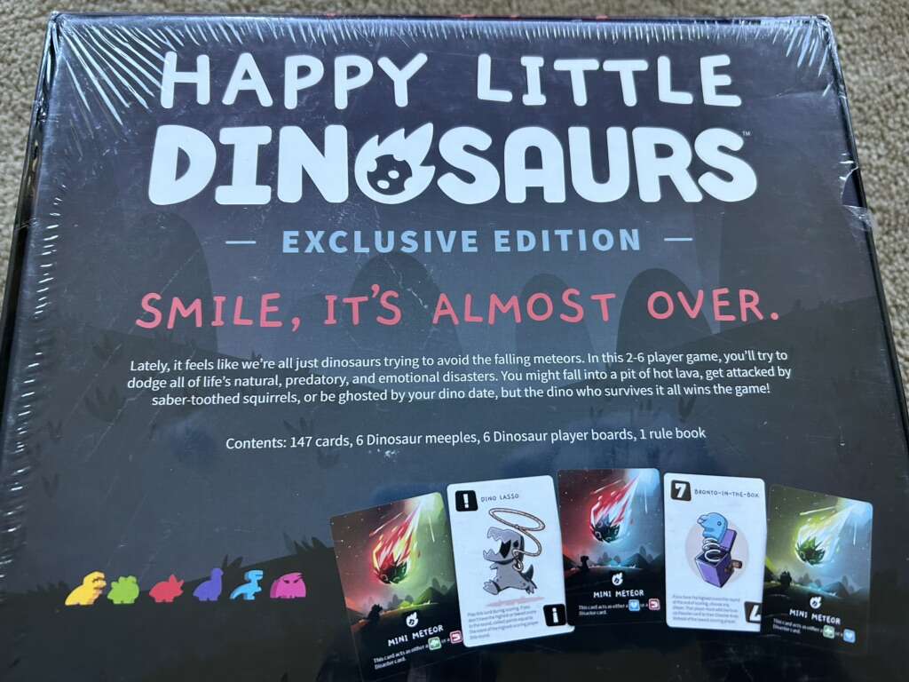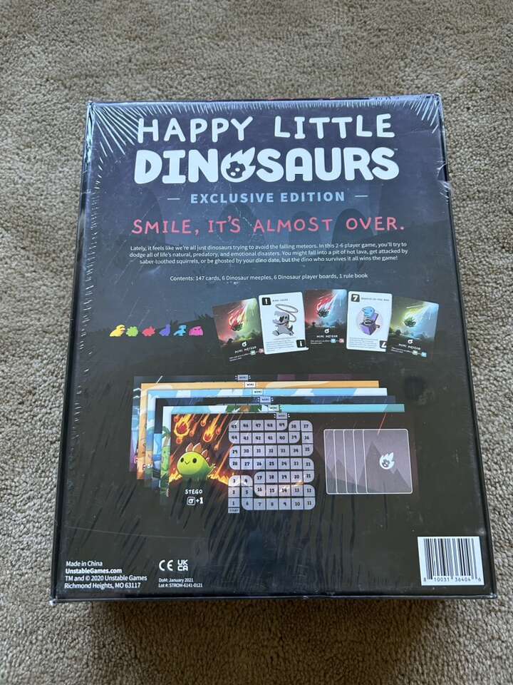 NEW (sealed in plastic) Happy Little Dinosaurs: exclusive edition. Contains the core game, the 5-6 player expansion pack, and 5 exclusive cards. “Smile, it’s almost over.” By Unstable Games, 2020. 2-6 players, ages 8+. New, unopened condition. Text only. Cash or Venmo. Discount on multiple items.