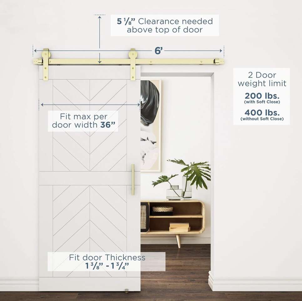 About this item Adds custom design and privacy to a door opening Full track design for single doors up to 200 lbs. with soft close installed, 400 lbs. without Soft-close kit included with kit Features an all metal wheel design to enhance door functionality Includes all mounting hardware and components to hang one barn door Accommodates openings of up to 36" For single doors 1 3/8" and 1 3/4" thick
