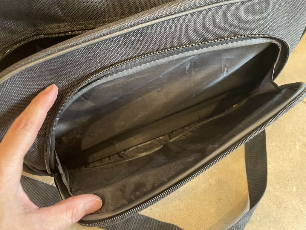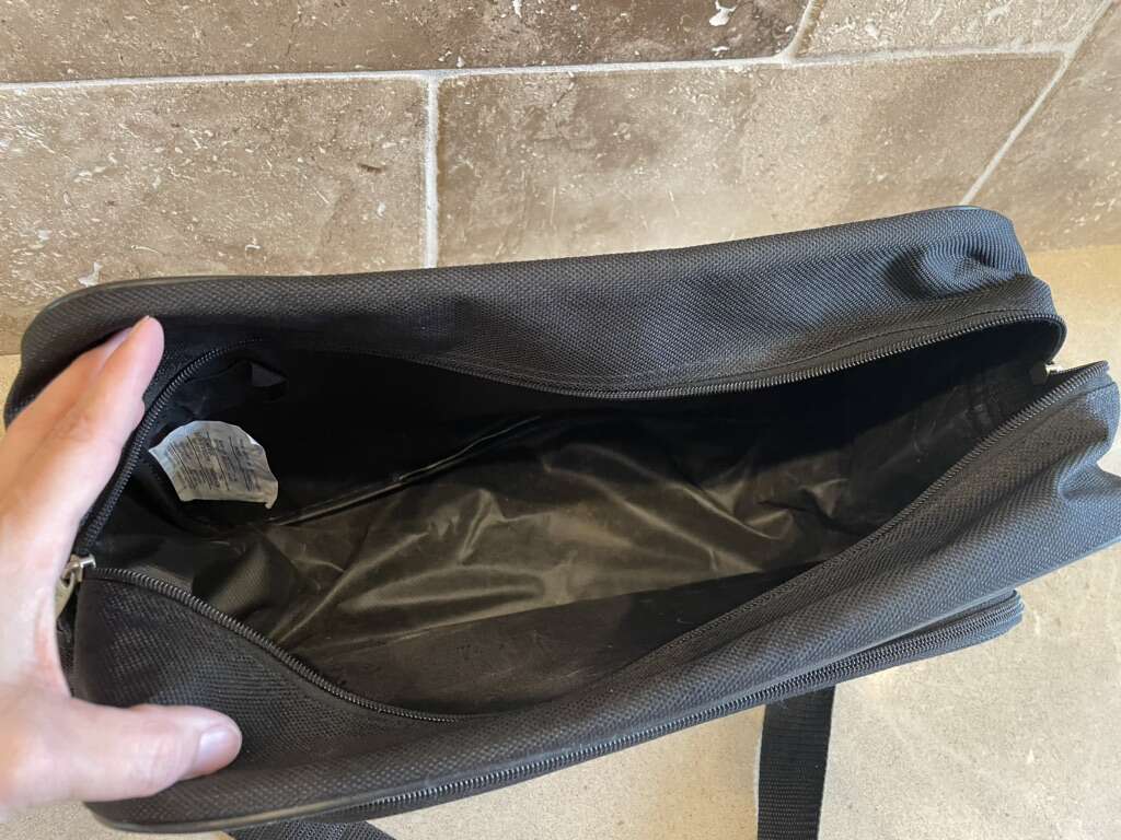I have a black American Tourister shoulder bag for traveling. It is one main pocket and a smaller zipper pocket on the front. It is 16 inches wide, 10 1/2 inches tall and up to 5 1/2 inches deep. It’s a thick canvas like a suitcase that is in good condition but it does have a small flaw (see the last picture for a close up). See my other ads for jewelry, artwork, home decor and more.
