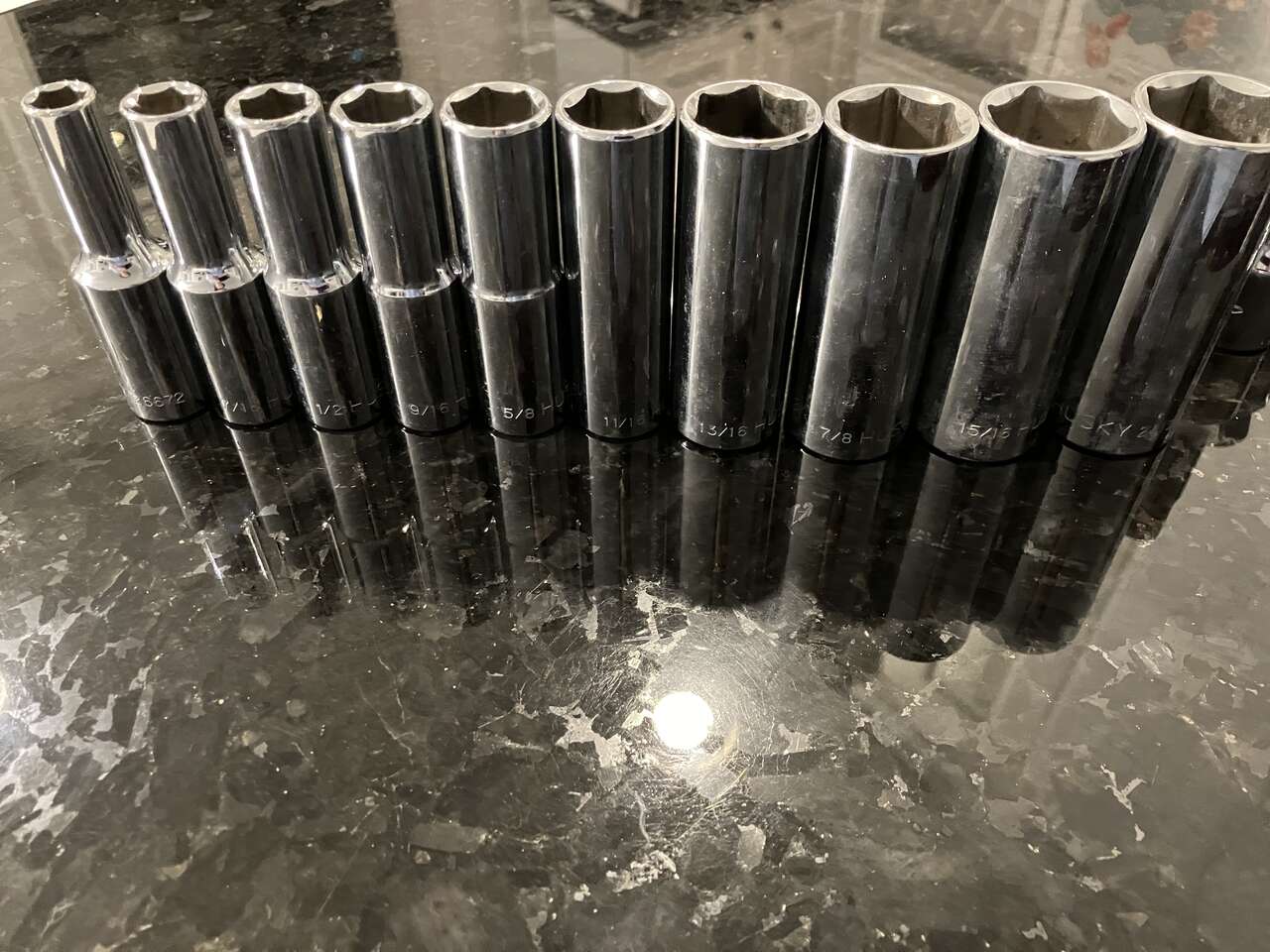 Venmo3 SETS, CAN BE PURCHASED SEPARATELY OR ALL TOGETHER. 5 Misc Extenders in the center of photo #1 (or larger in photo #2) $10. Set of 10 Sockets on Left Side in photo #1 (or larger in photo #3) 9/16, 3/8, 1/2, 5/8, 7/8, 11/16, 13/16, 15/16, 1 in, 7/16 $35. Set of 11 Sockets on Right Side in Photo #1 (or larger in photo #4: #10, #11, #12, #13, #14, #15, #17, #18, #19, #21, #22 $40. Not selling individual sockets. Buy all 3 sets and save. Cash/Venmo. In Sandy. 801-201-5350.