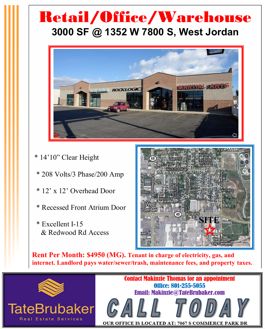 3000 SF of Retail/Flex off of 1300 W and 7800 S in West Jordan available immediately. This space was recently painted and carpeted, has a large kitchen/break room, 2 offices, open office space, a restroom, + 1800 SF of high-quality warehouse. The rent is $4950 including all fees except electricity, gas, and internet. Call today to schedule a showing!