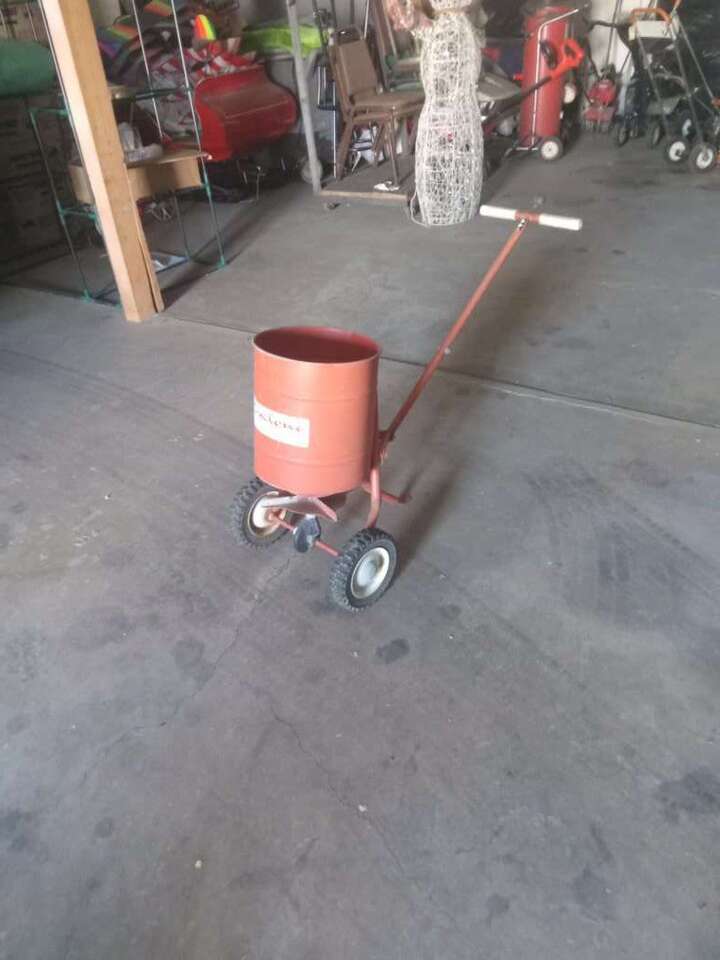 Red, vintage, metal seed spreader.