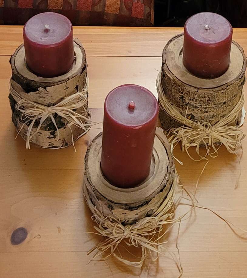 3 rustic candle holders wood bark cabin home decor Candle holders themselves (nor counting the actual candles on them) measure 6.5" 5.5" 3" Message anytime! (801)472-2627