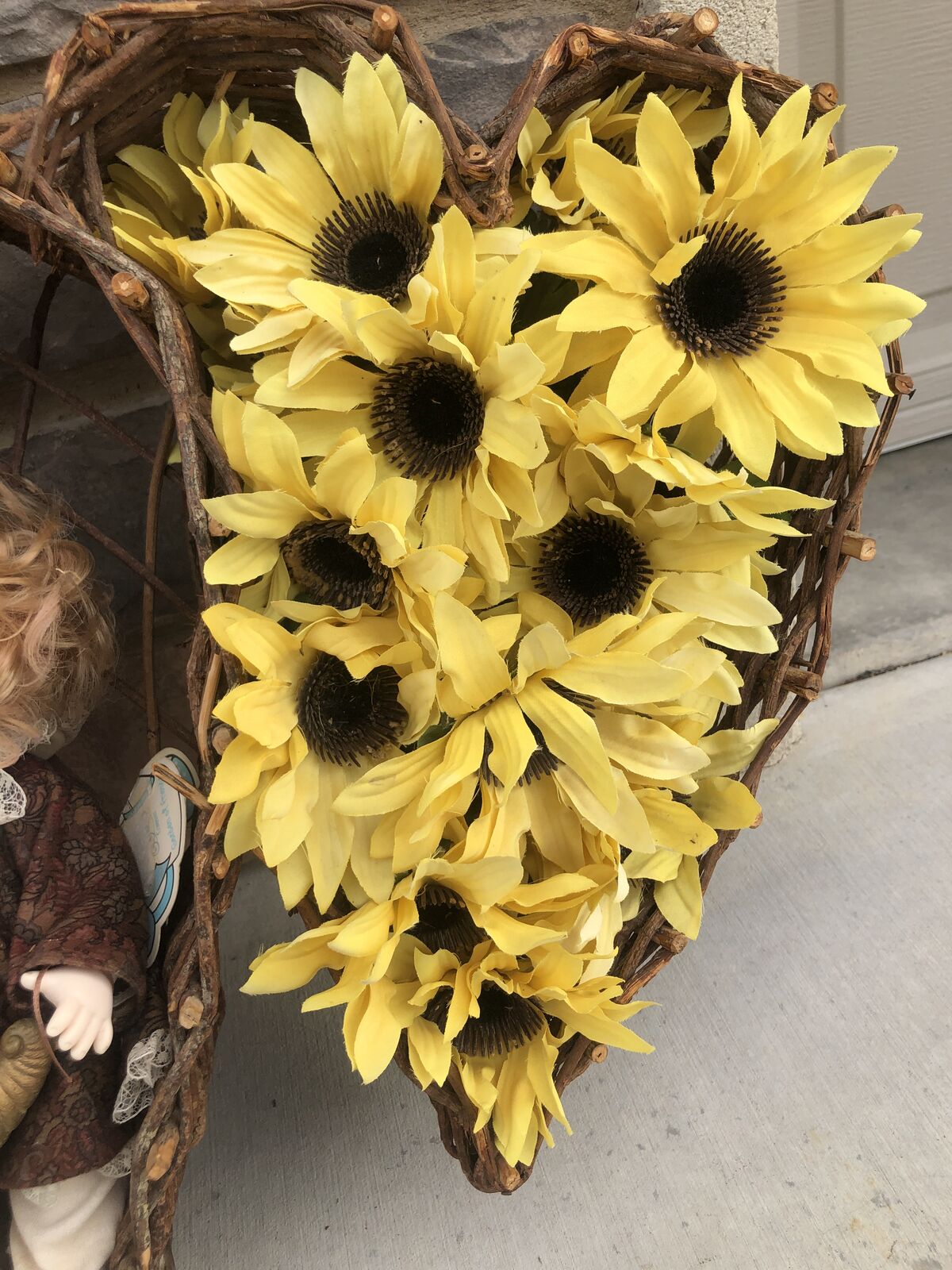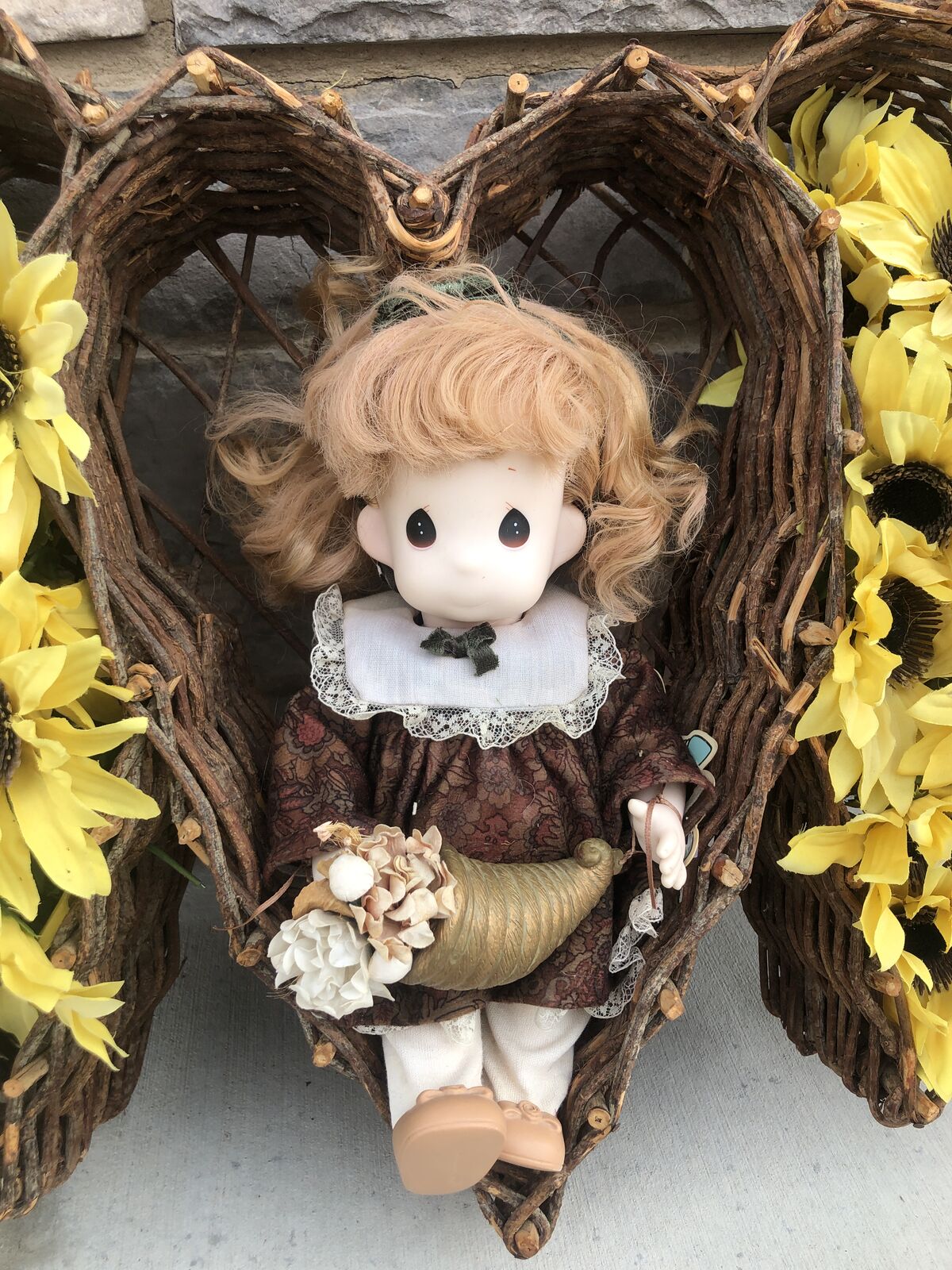 VenmoWelcome the cozy season with this gorgeous handcrafted fall wreath! Featuring a triple heart grapevine design filled with golden-yellow sunflowers, this piece captures the warmth and charm of autumn. At its center sits a sweet porcelain doll dressed in rich fall tones, holding a cornucopia overflowing with harvest spirit. Perfect for your front door, entryway, or wall décor, this unique wreath brings a rustic, heartwarming touch to your fall decorations. A beautiful blend of vintage elegance and seasonal cheer!