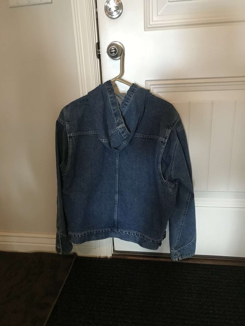 Women's Vintage Denim Hoodie Jacket. This Denim Jacket is a zip up hoodie! It has great character and is in excellent condition! It has extra room for arm movement, full zip, brass push button drawstring. 22" pit to pit 24"L. The sleeve length is 18.5". You can come over to try it on.